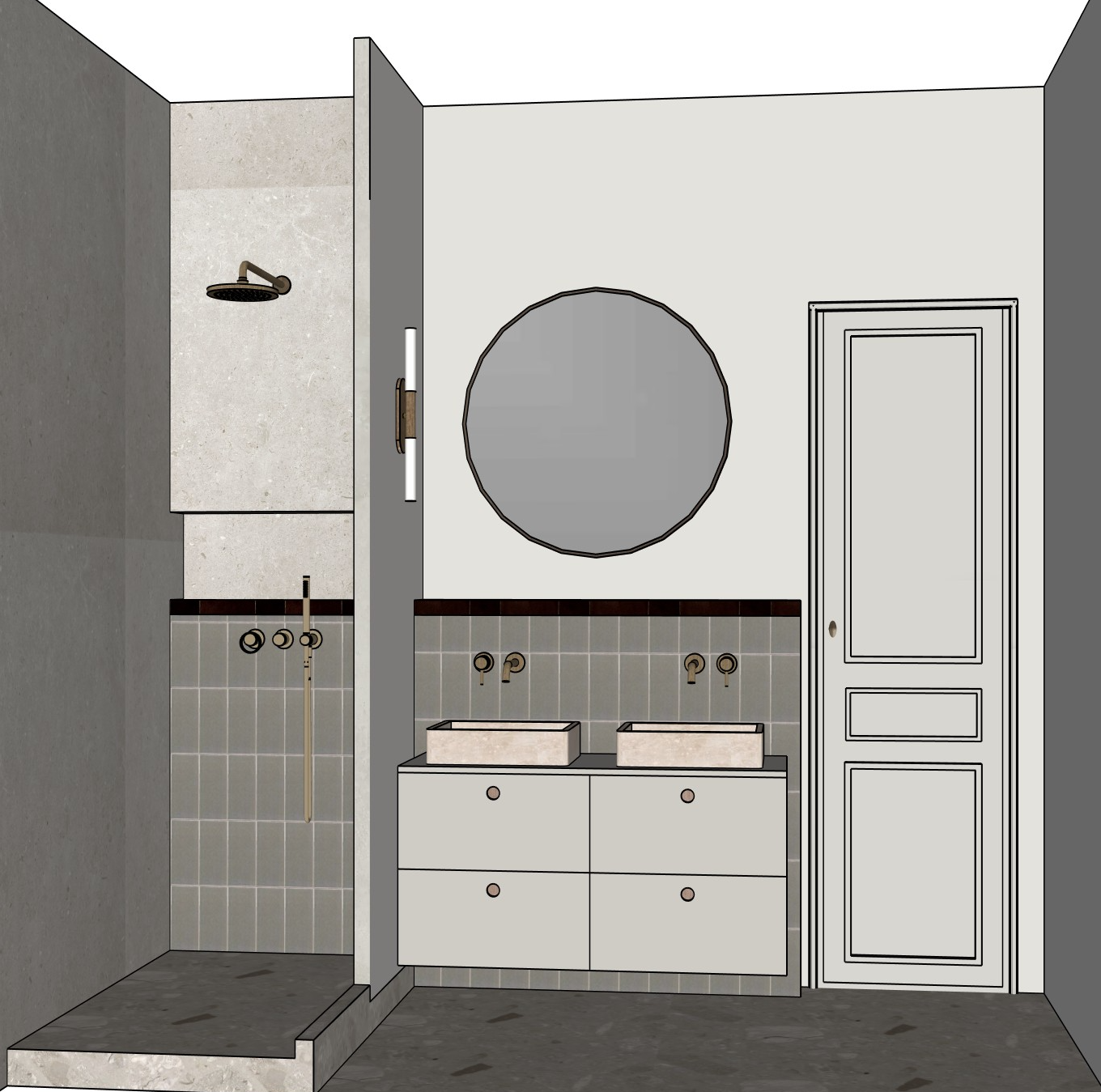 the light sage green tiles are these https collectionsdarchitectes fr products rebels variant 55436883657048 the floor in front of the vanity and the shower is in beige terrazzo like this one https www leroymerlin fr produits carrelage imitation ciment et terrazzo ninov mona rectifie beige 80x80 1 28 m2 70423854 html megaboost at medium sea paid at campaign pd 06 soletcarrelagemural pmax shp pla top 3p at source google at market m4 at section r6 at campaign id 20490834400 at campaign type pmax at account leroymerlin marcheprojetdeco at account id f149fwwg gclsrc aw ds gad source 1 gad campaignid 20486532698 gbraid 0aaaaadgndyvx6pqykdmr3o zucbqo3cvi gclid cjwkcajwqazpbhaleiwaouxqdgnalnmckgyujh8mx abzhznd3b5g8xnzvezcd1s9pcienoietiqehocqk0qavd bwe the dark burgundy tiles are these ones https www leroymerlin fr produits zellige marocain 5x5 cm carrelage mur terre de zellige vendu a plaque 30 x 30 cm prix indique a plaque marron fonce 07 92850626 html megaboost at medium sea paid at campaign pd 06 soletcarrelagemural pmax shp pla top 3p at source google at market m4 at section r6 at campaign id 20490834400 at campaign type pmax at account leroymerlin marcheprojetdeco at account id f149fwwg gclsrc aw ds gad source 1 gad campaignid 20486532698 gbraid 0aaaaadgndyu24fsizrql17ggtgvmkjt4d gclid cjwkcajwhqfpbhbweiwazo196qsg0arjg6zdn4obhk3vyetlz8iin9raesarttkucqf0reu0cphzrxocgy0qavd bwe the walls of the shower are in living ceramics beren light grey the vanity is in farrow and ball purbeck stone https www farrow ball com fr peinture purbeck stone the sinks are in travertine the wall behing the mirror and the door should be in light greige a plain wall should be visible in the mirror
