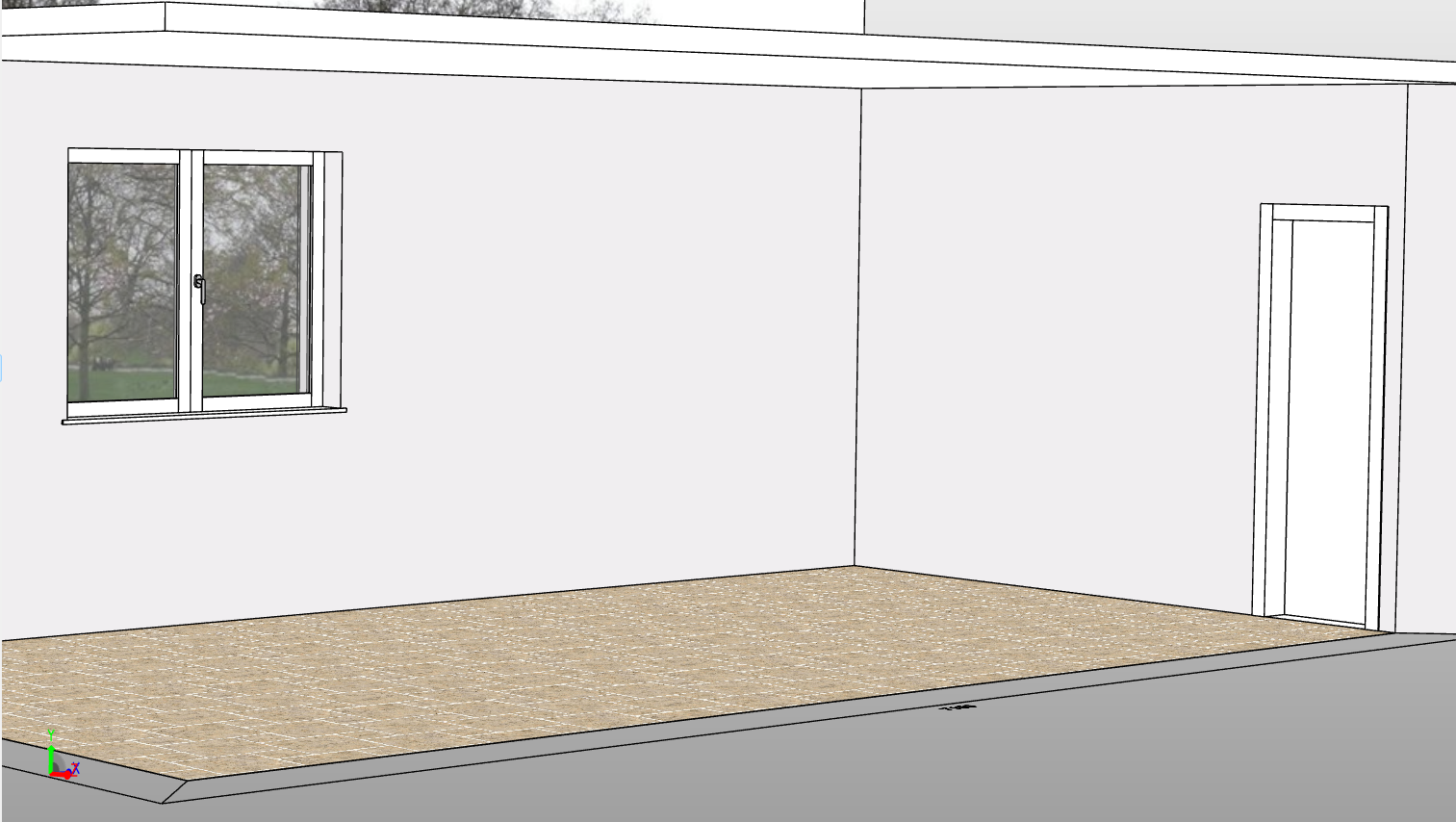 crea una cucina ad angolo posizionata tra la finestra e la porta con un isola al centro