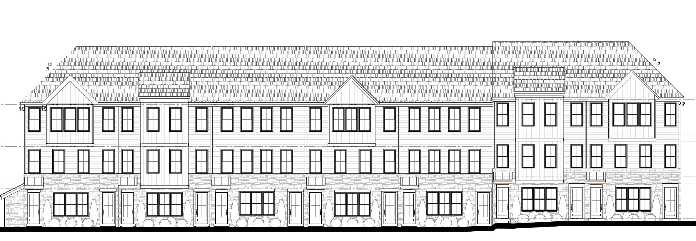 render with brown stone on the first story black vinyl windows throughout grey and white vertically alternating siding and a medium gray shingle roof