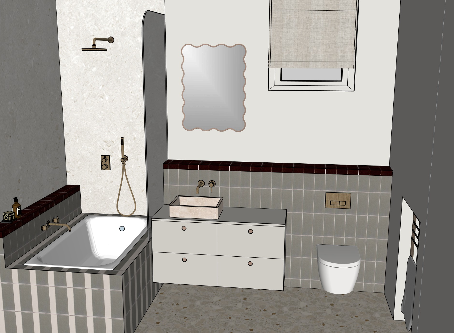 the sink is in beige travertine the floor is in light beige terrazzo like this one https www asdecarreaux com 29503 carrelage imitation ciment et terrazzo ninov mona rectifie beige 80x80 128 m html utm source google utm medium cpc utm campaign 5bpmax 5d 5bhm 5d 50 utm id 21290223769 gad source 1 gad campaignid 21286339136 gbraid 0aaaaadsggbcqtztpsc0sg9xcbce2zp8on gclid cj0kcqjwv lobhcdarisam5hdkdeh8flvcawyizpzdcuexdtykcweidtcoin7vtzwqeinz5jvyc3fjuaao6xealw wcb the look and feel should be more moody the tiles of the bathtub are light greige and light grey green the dark top of the tiles is in bordeaux tiles like these https www leroymerlin fr produits zellige marocain 5x5 cm carrelage mur terre de zellige vendu a plaque 30 x 30 cm prix indique a plaque marron fonce 07 92850626 html megaboost at medium sea paid at campaign pd 06 soletcarrelagemural pmax shp pla top 3p at source google at market m4 at section r6 at campaign id 20490834400 at campaign type pmax at account leroymerlin marcheprojetdeco at account id f149fwwg gclsrc aw ds gad source 1 gad campaignid 20486532698 gbraid 0aaaaadgndyuwoacjoaum4iobvba zuq9z gclid cj0kcqjwv lobhcdarisam5hdkcx6pncletb59i0crvhtw7klg1pq6ly9uhxcqhx0n6ipsjhm0q0yjiaai6dealw wcb
