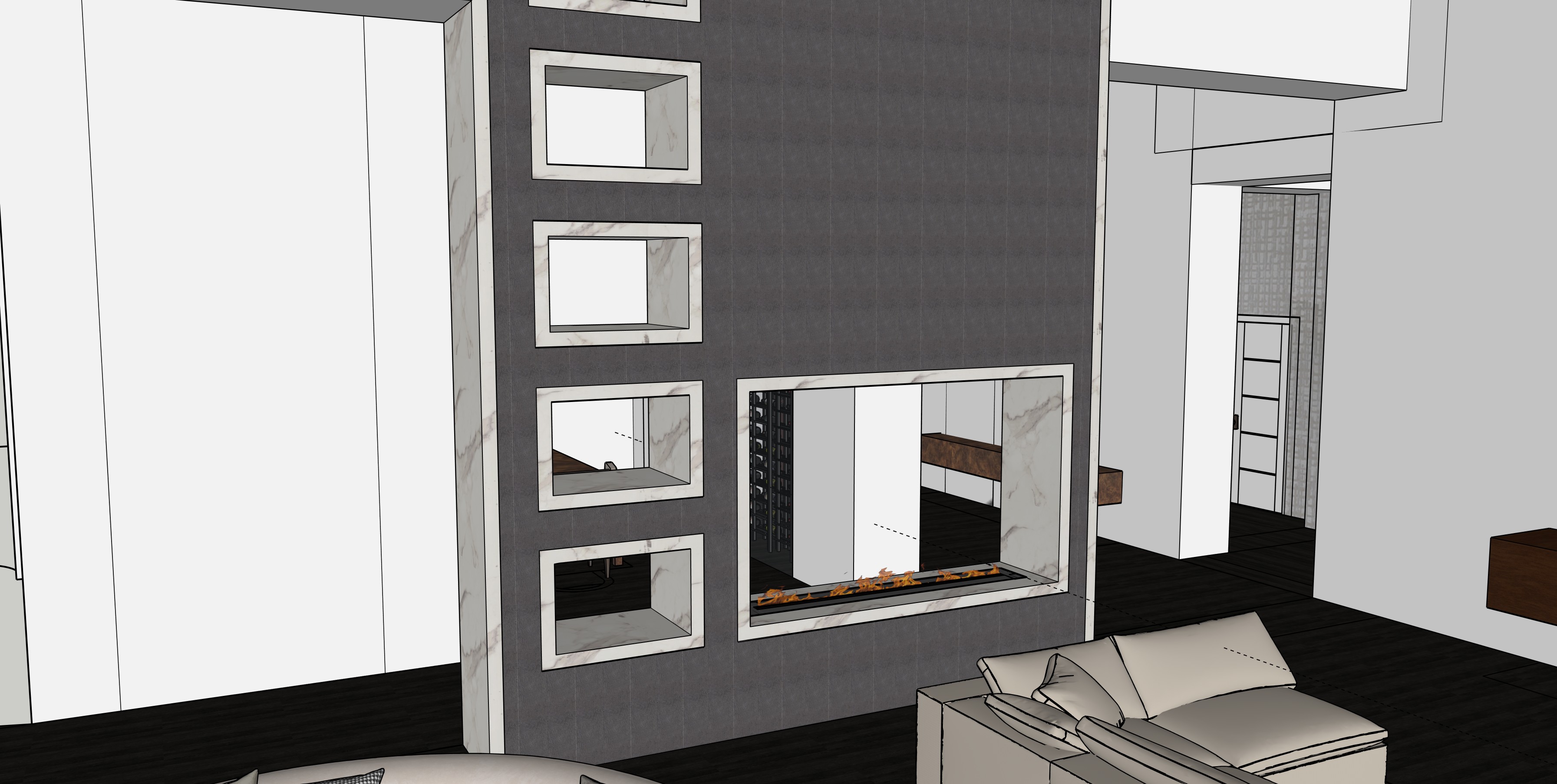 a modern fireplace with bronze stamped textured tile that sparkles in the light white calcatta marble with soft subtle warm veining on left and right sides and around each opening a linear flame in large opening see thorugh the firebox to get a peak of a wine display each opening to have linear lighting to illuminate each box