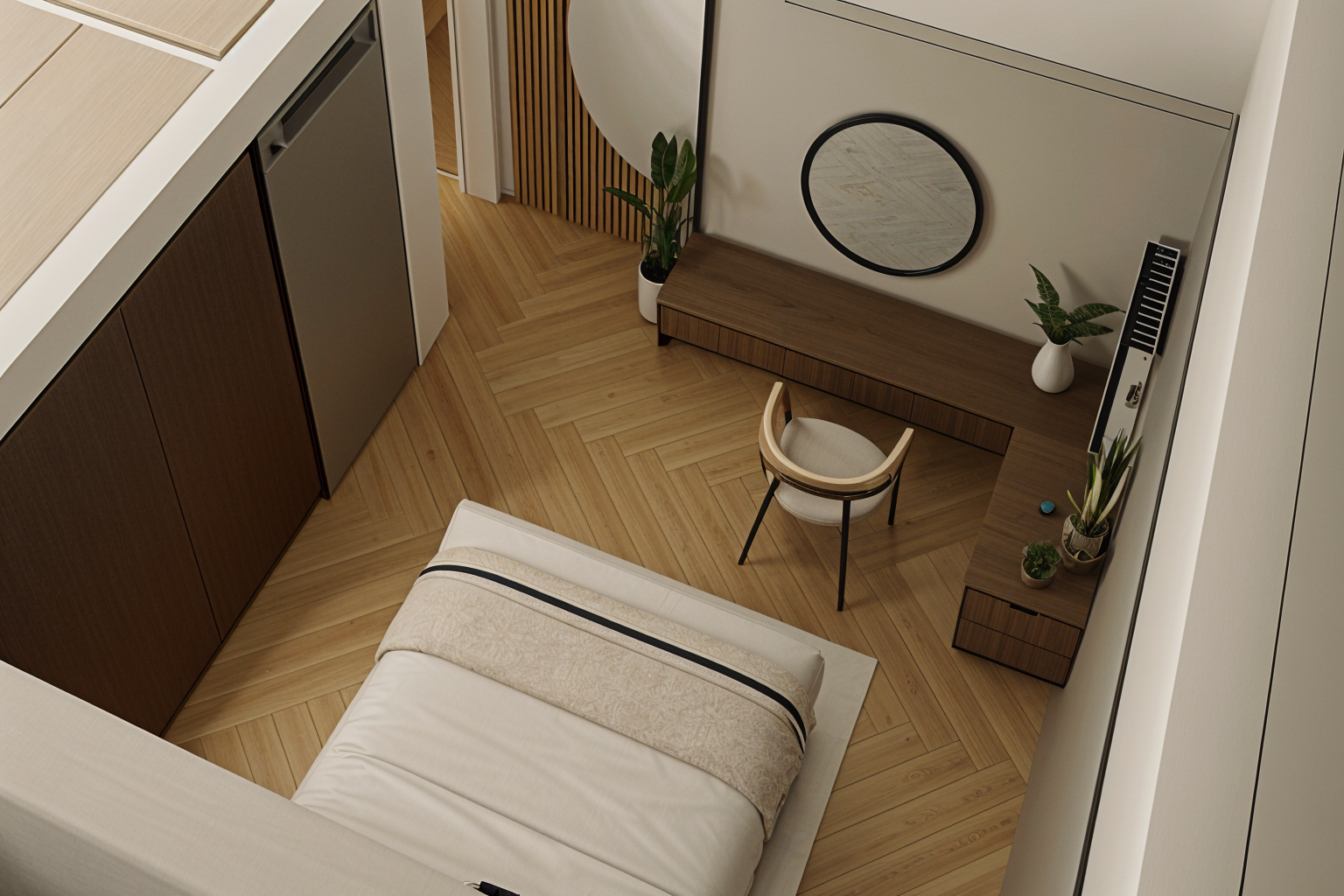 exterior walls are light gray stucco there is a stucco chamfered bay window on the ground floor the upper floor is grey vertical board and batten siding there is brick siding at the base the entrance porch is white painted wood there are trees in the background and in the front yard there are shrubs and flowers between the sidewalk and the low landscape wall
