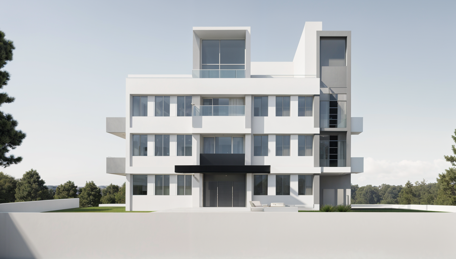 louis sullivan exterior shot render a modern minimalist building with a clean design the facade is painted in a soft creamy white color the windows are large and tinted with light gray glass the entrance door is sleek featuring a combination of dark gray and black surrounding the entrance is an elegant black awning the building is set against a clear bright blue sky with gentle sunlight casting soft shadows creating a serene and inviting atmosphere the overall mood should feel modern fresh and welcoming with a focus on simplicity and clean lines architecture