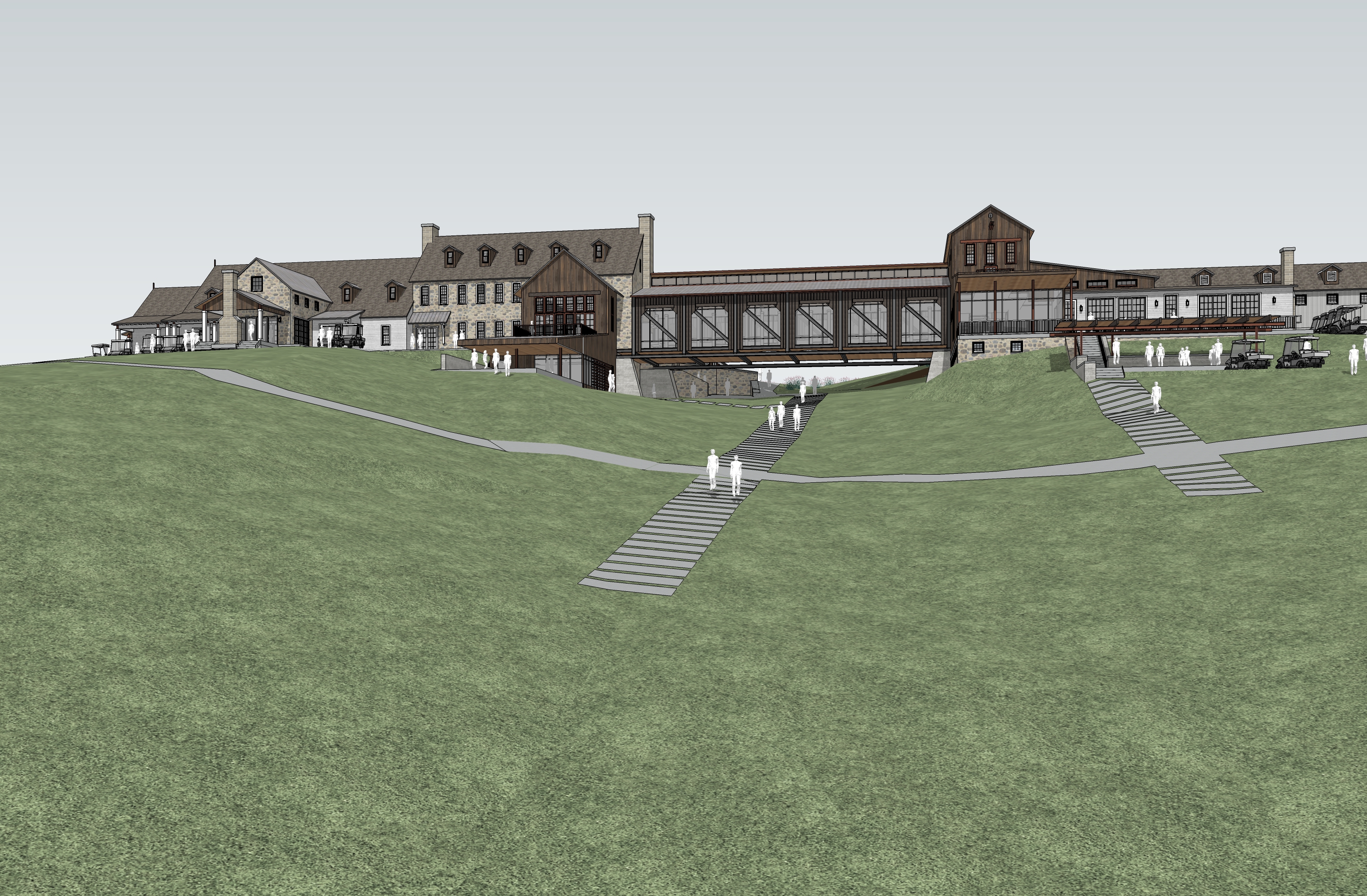 18th putting green foreground tall grass with small creek running under bridge stone farmhouse with vertical wood shiplap mill set into hillside fog trees in background