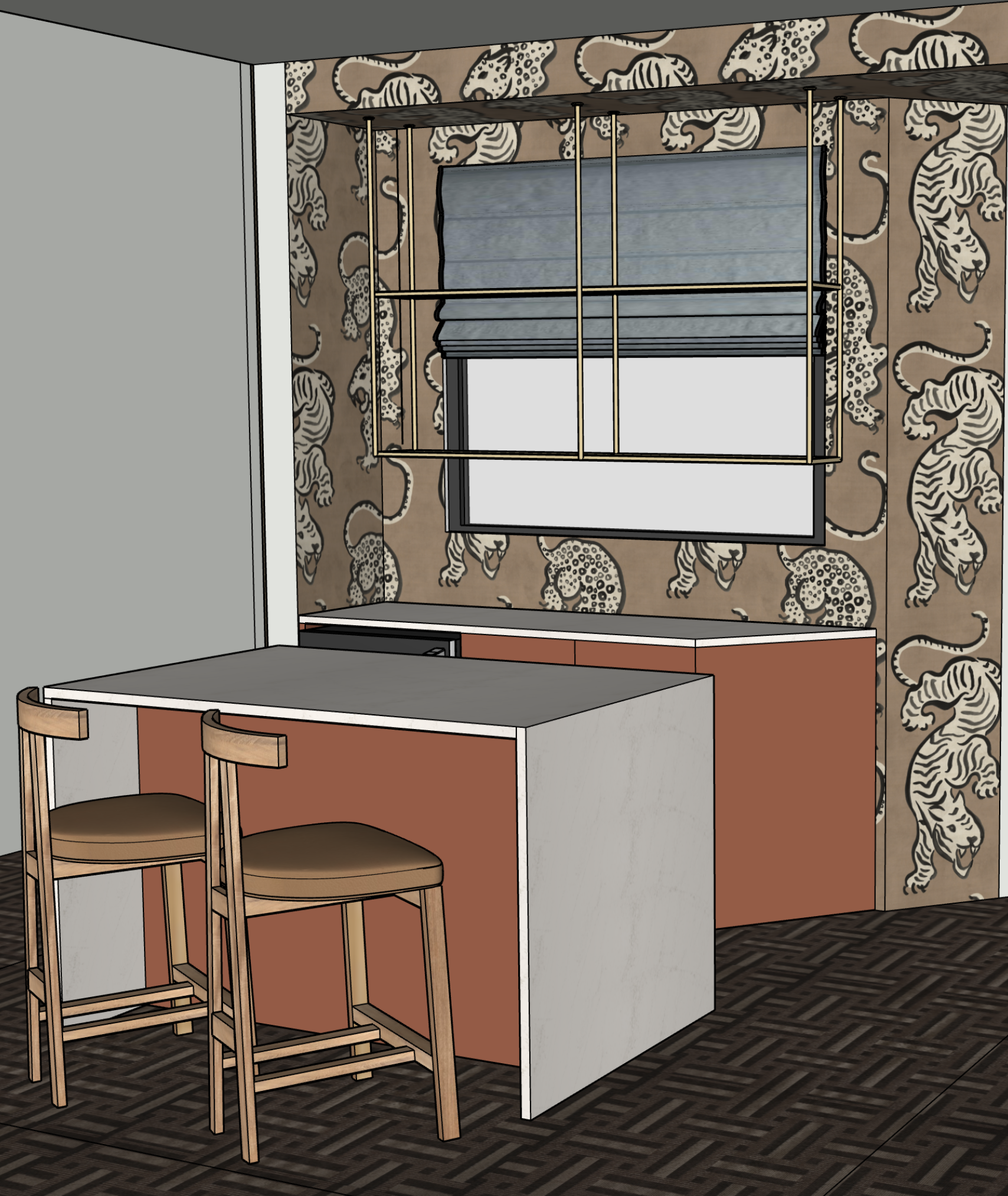 here is your fully updated clean copy ready master prompt with that correction ultra realistic interior render of compact bar vignette left wall must remain completely open and blank drywall no tall cabinetry no upper cabinetry no base cabinetry no built ins no millwork the left wall is intentionally empty and clean only cabinetry allowed is base cabinetry under the window and island cabinetry do not add any additional cabinetry cabinetry is high gloss lacquer in a rich terracotta tone warm earthy terracotta with burnt clay undertones and slight orange brown warmth not fire engine red not burgundy not cherry red finish must read highly polished and reflective with golden hour light softly bouncing across the surface countertop is caesarstone 5113 solenna with a warm creamy base and subtle organic veining soft movement not stark white waterfall edge on the island back wall features the tiger wallpaper with warm tan ground and black and cream tiger motif window has an inside mounted tailored roman shade in soft blue gray linen mounted within the window frame shelving is a ceiling mounted brass and glass bar shelving system suspended from above with slim warm brass supports and clear tempered glass shelves the structure should appear architectural and refined warm brass finish no matte black shelving lighting over island is a sculptural wavy linear chandelier in deep oxblood or burgundy metal finish continuous serpentine curved metal arm with five evenly spaced frosted glass globes two slim vertical suspension rods soft warm glow not brass flooring is wall to wall woven geometric carpet in brown taupe and cream interlocking pattern reference image provided carpet extends across the entire room from wall to wall no tile no wood no transition strips the carpet should read continuous and fully installed throughout the entire visible floor area exterior view shows jordanelle reservoir mountains in park city utah at golden hour warm low sunlight entering the space with long soft shadows and warm glow reflecting on terracotta lacquer and lighting fixtures lighting mood is cinematic golden hour warm but balanced accurate reflections on lacquer and quartz no overexposure rich contrast camera at eye level slightly angled toward the island with the left wall clearly visible and blank ultra realistic luxury editorial photography 8k resolution