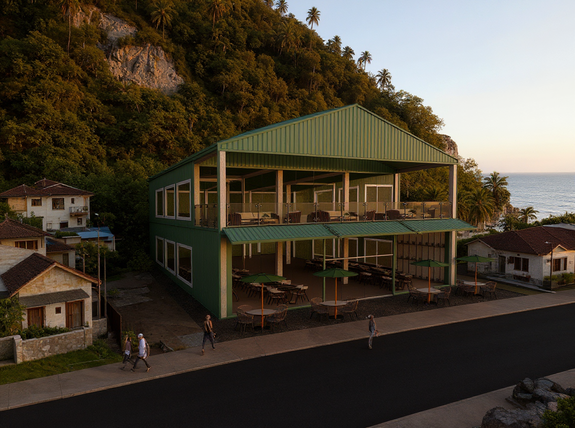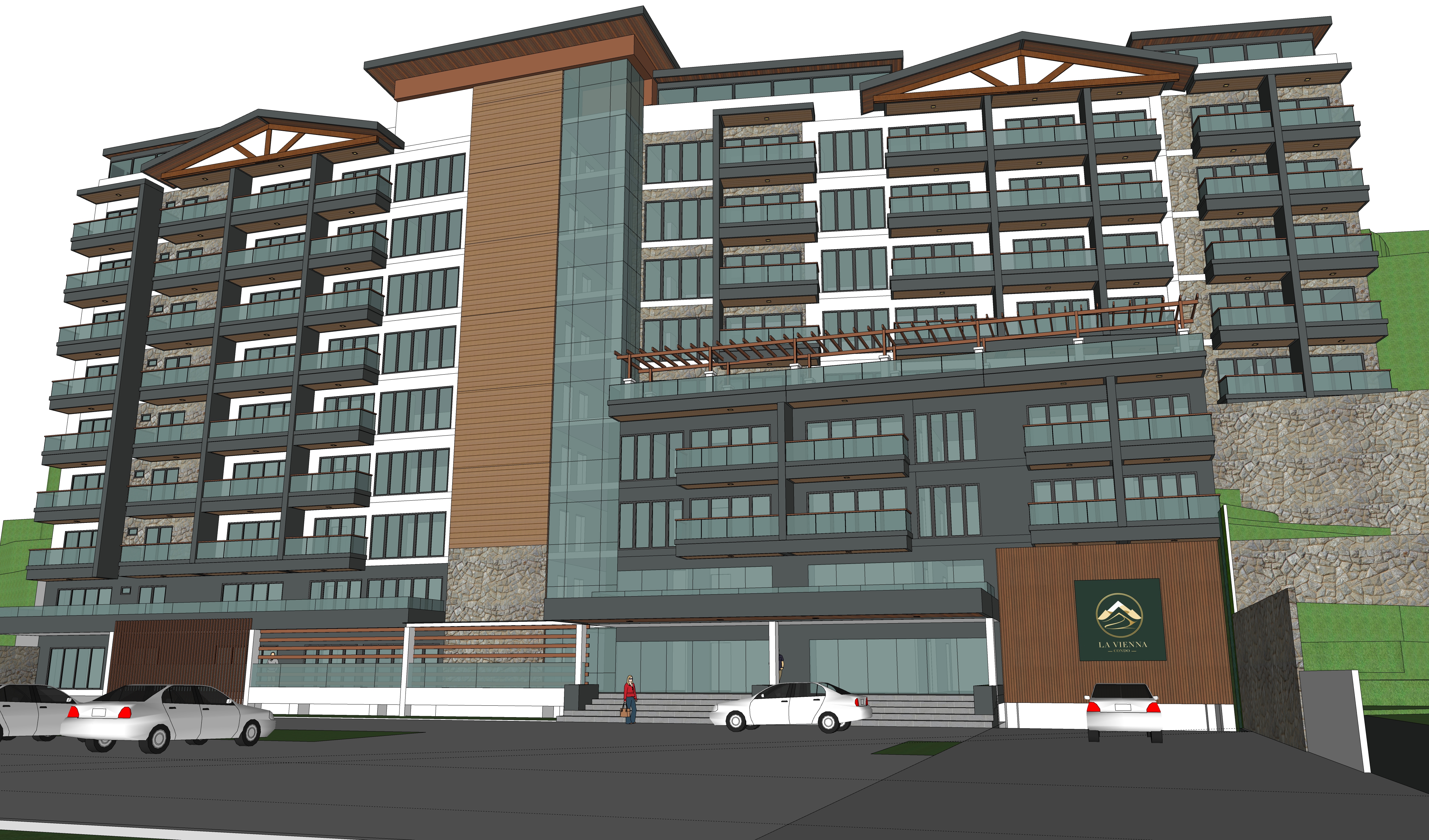 render a modern multi story building with a sleek and contemporary design featuring large glass windows reflecting the sky use earthy tones for the exterior walls combining deep charcoal warm wooden panels and natural stone accents the balconies and railings should be a polished steel gray surround the structure with lush greenery vibrant and fresh set this scene under a clear blue sky with soft natural sunlight creating an inviting and tranquil atmosphere