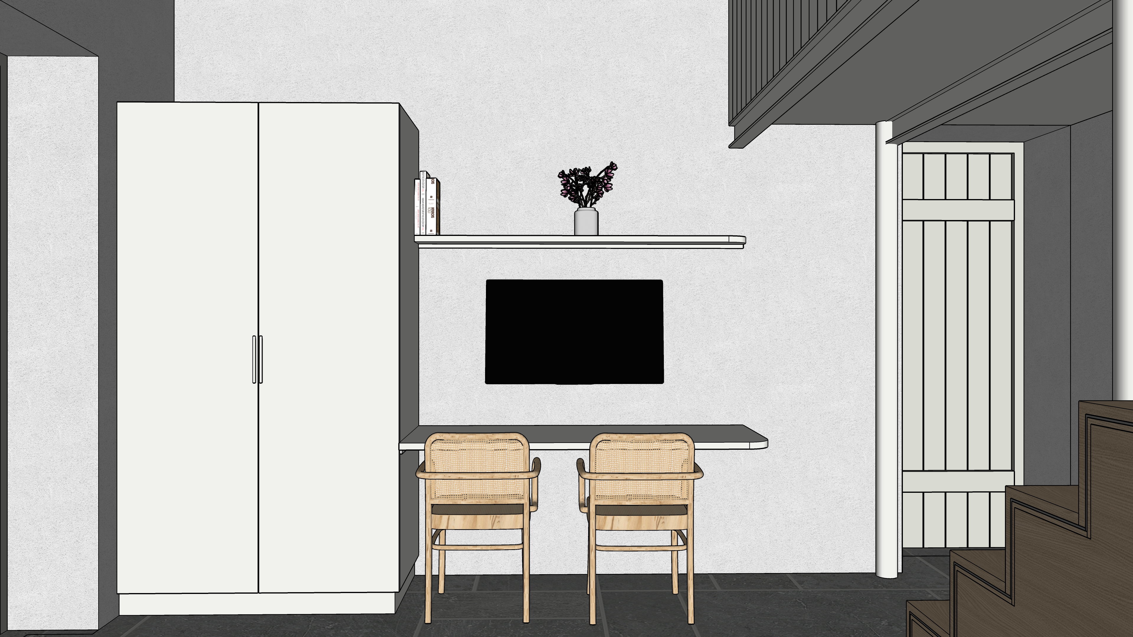 main prompt this is a cycladic house in kythnos the floor is natural gray pelion stone there is wooden stair leading to the mezzanine which is made of metal in white color and light oak wood there is natural light negative prompt do not change geometry do not add pbjects do no change colors or materials