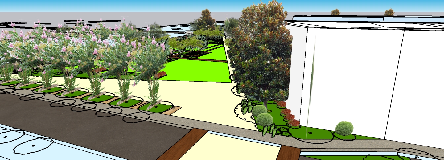 can you realsitically render this image making that beige concrete textured and make the green into grass and in between the trees on the left it should be like fakee wood material and the right of it should be asholat as well and