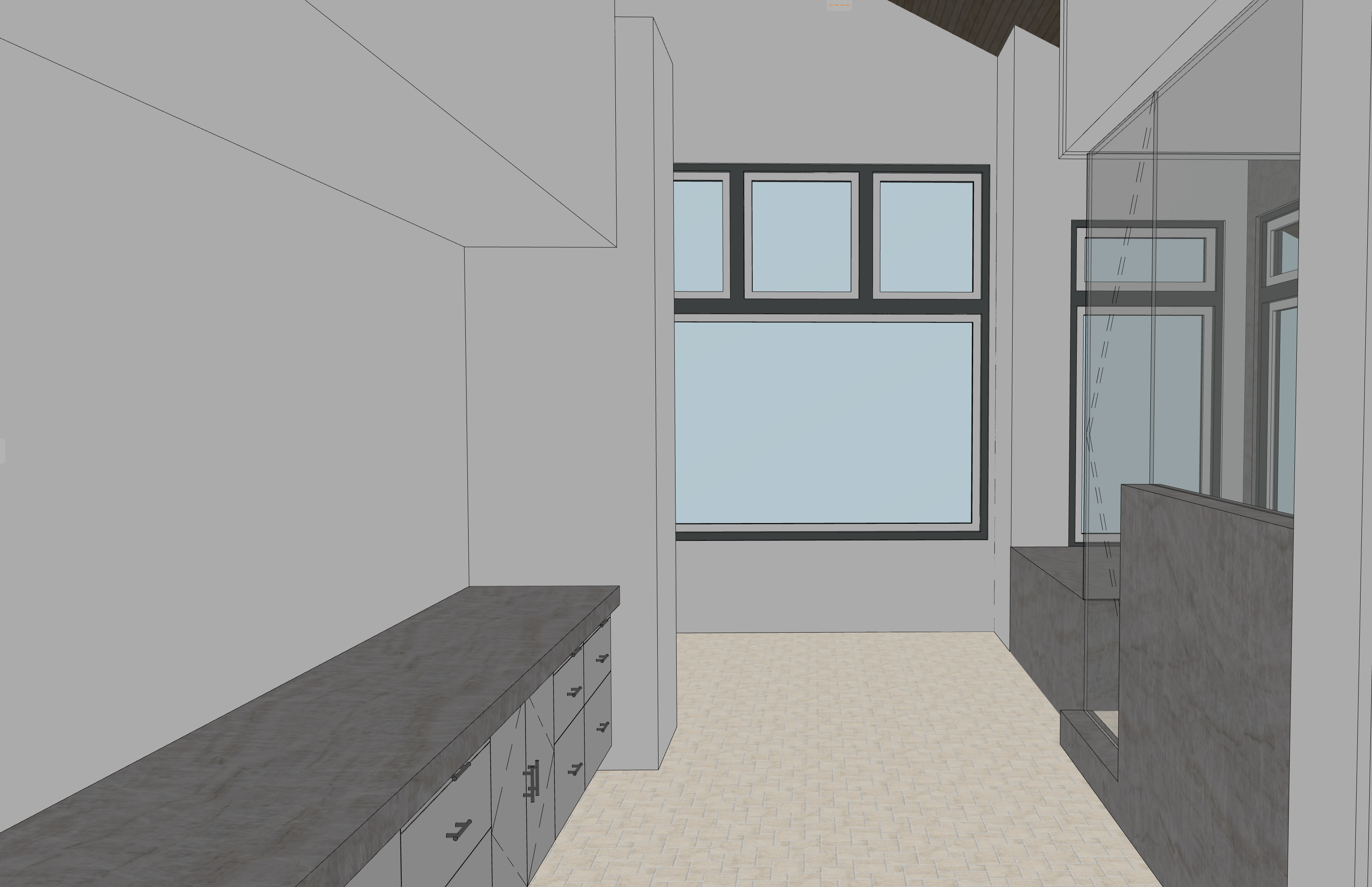 enhanced interior lighting white quartz slab countertop same white quartz slab 6 inch backsplash same white quartz slab shower wall and tub deck two porcelain undermount sinks brass deck mount faucets undermount tub in tub deck beyond shower small mosaic limestone tile on floor natural wood white oak simple cabinetry with brass hardware tan plaster on walls wood trim around opening on left with large wood header full width mirror above sinks 3 evenly distributed skinny cylinder frosted glass sconces with one of them centered in ceiling lights in soffit above sinks soft accent lighting underneath the mirror natural medium brown wood tall baseboard natural medium brown wood window trim and window cladding