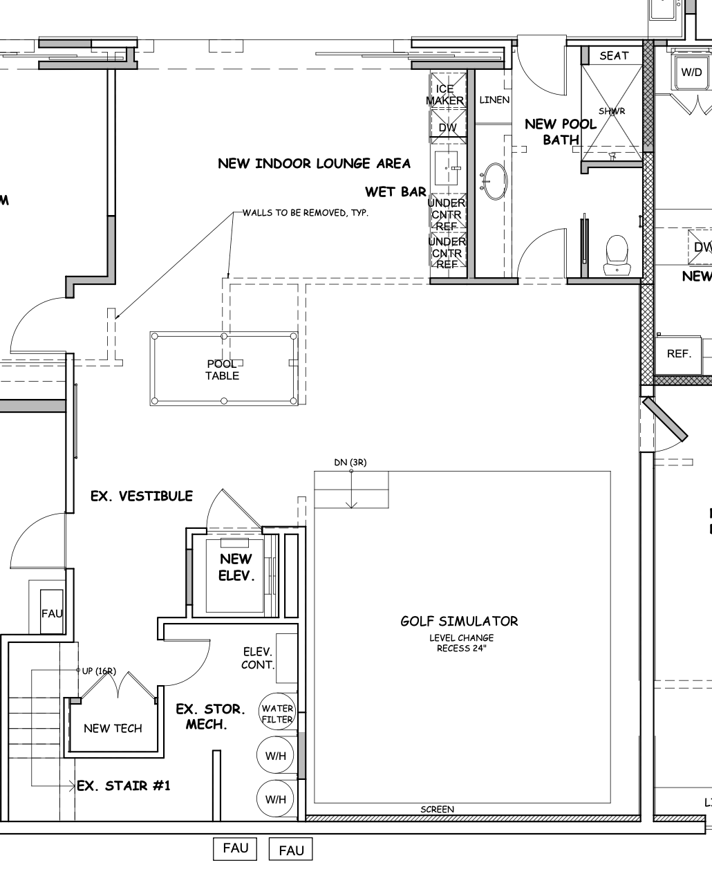 prepare a rendering based on floor plan showing golf simulator with a counter bar seating seating in the lounge area and bar pool table