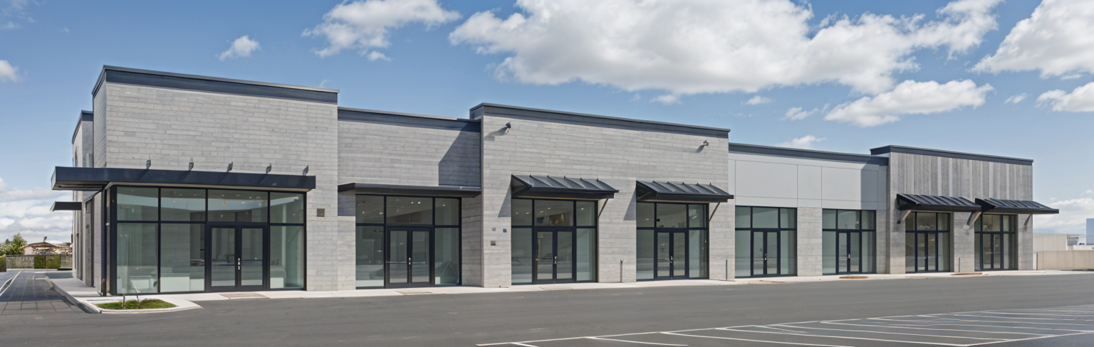 exterior shot modern commercial building with a minimalist design featuring a combination of warm natural wood and dark grey bricks the facade showcases vertical wooden panels in warm natural wood large clear glass windows and doors are framed in matte black reflecting a contemporary and upscale vibe the atmosphere is calm and inviting set under a soft overcast sky with diffused lighting to emphasize the texture of the materials and the clean lines of the architecture the pavement in front is a smooth dark slate complementing the modern aesthetic