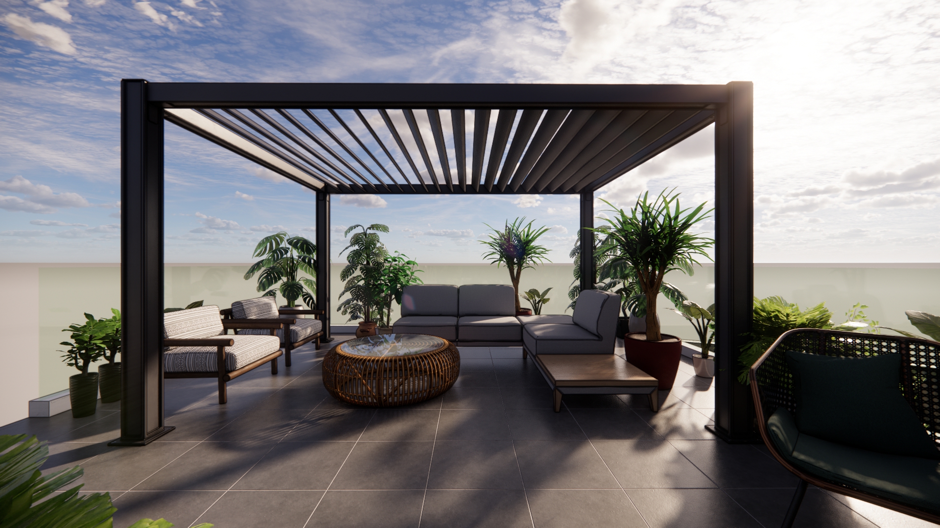 render de terraza en tercer nivel mantener el mobiliario y la distribuci n existentes mejorar las texturas de la mesa las sillas el piso y plantas para un aspecto realista agregar decoraci n de jard n sobre la mesa plantas peque as flores maceta moderna incluir en el fondo al horizonte casas vecinas modernas de m ximo 2 niveles al fondo de techos planos considerando que est terraza se ubica dos niveles por encima de ellas y separada por una calle amplia asegurar que el cristal del barandal sea claro y transparente materiales iluminaci n y sombras realistas escena con apariencia natural