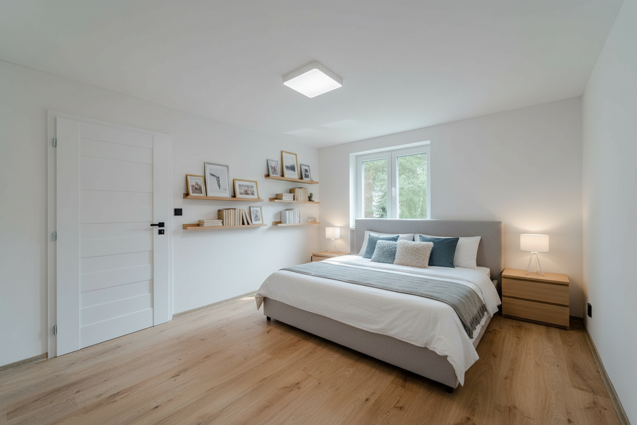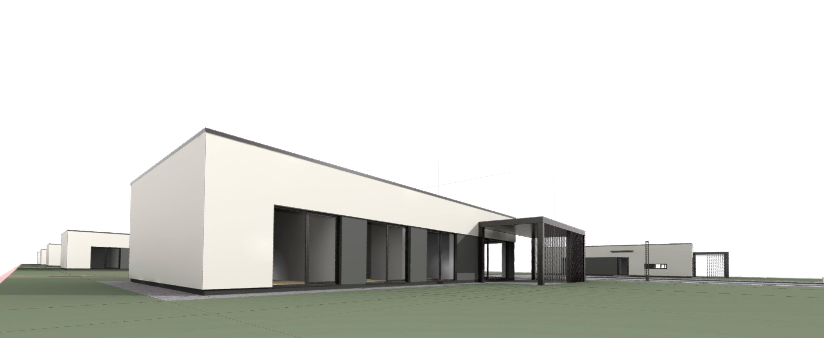 a modern architectural design featuring a series of sleek minimalist buildings the walls of the buildings are painted a clean soft white complemented by dark gray trim large glass windows reflect the surroundings creating an open and inviting atmosphere the roof is flat with a subtle gray hue the ground is covered with lush green grass adding a touch of nature the sky is bright and clear casting soft shadows and enhancing the overall brightness the scene conveys a calm contemporary and harmonious atmosphere in the background put some trees and to the right of the house put 3 scots pine trees
