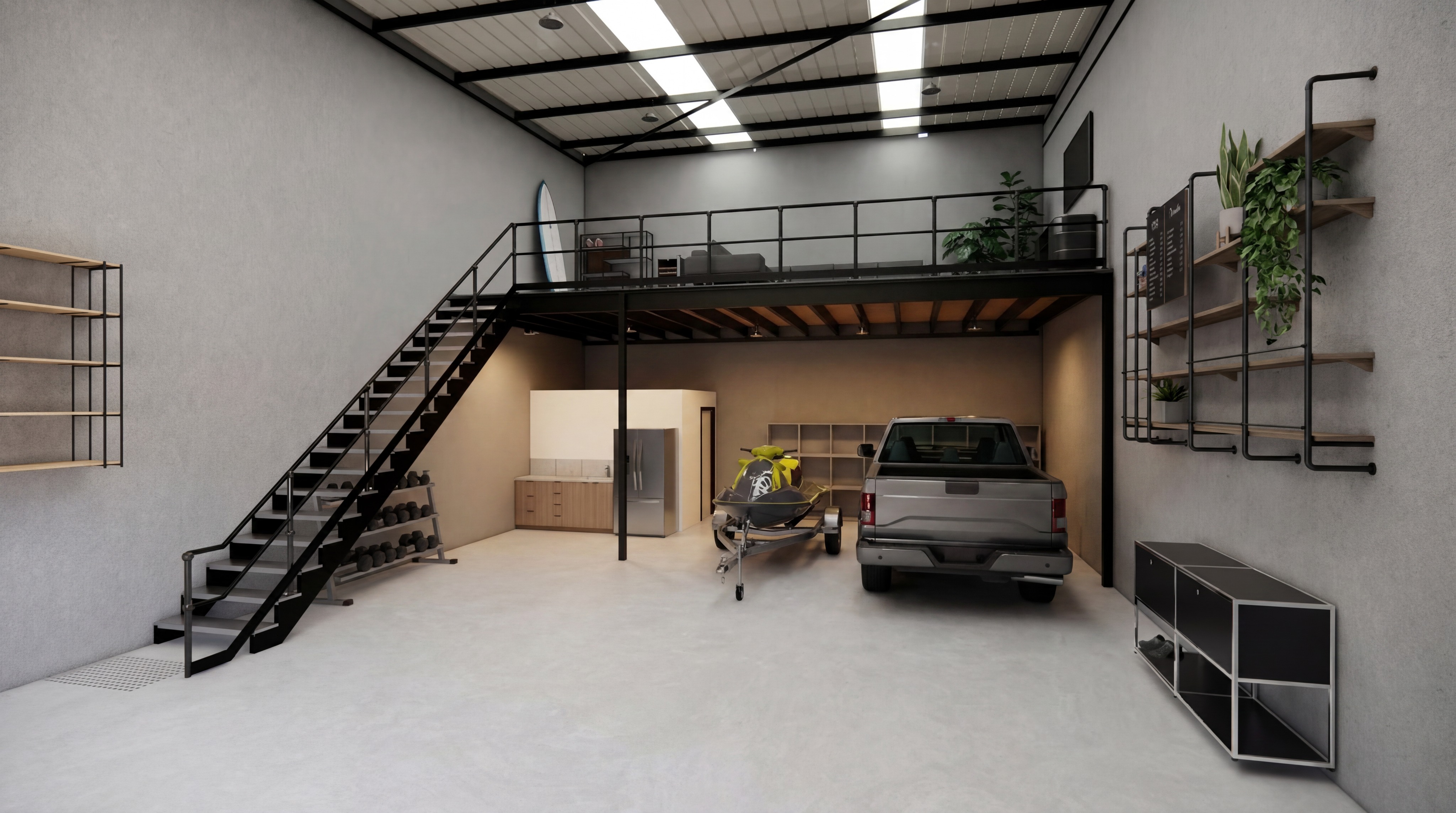 change concrete floor to be a little darker gentle lighting from sky light do not change anything with cupbaords