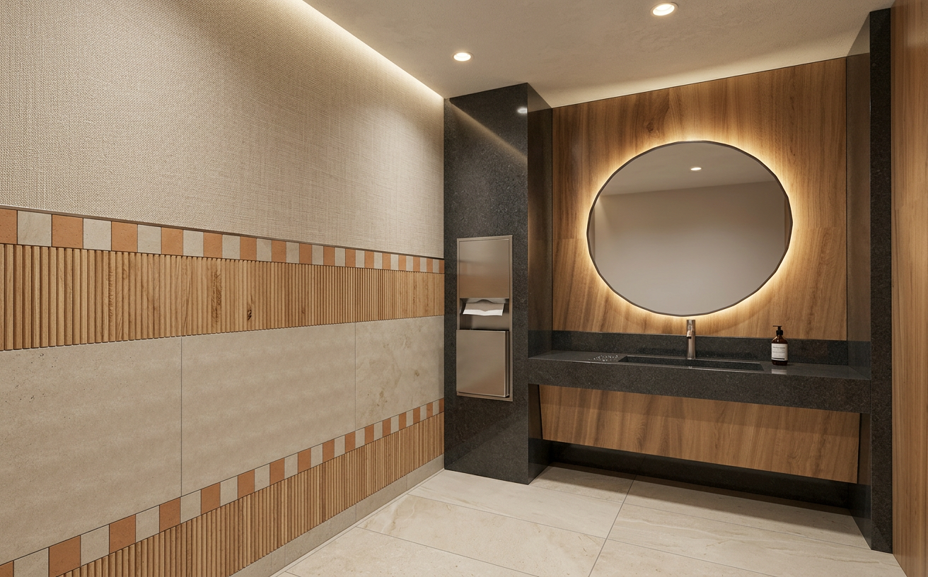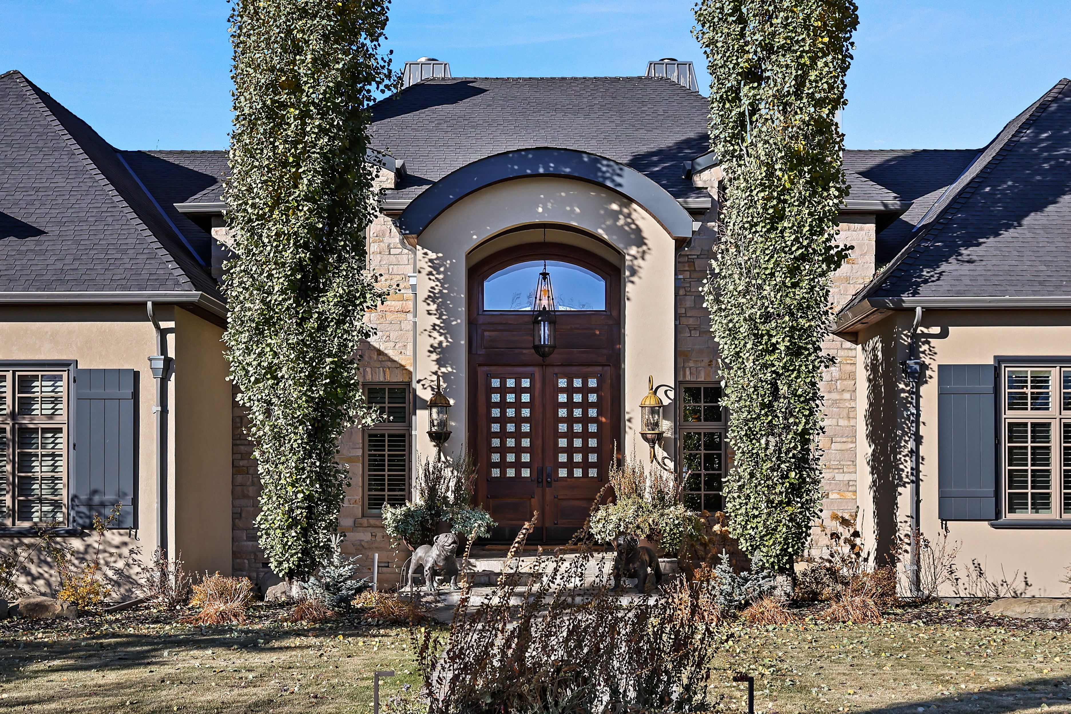 make the center stucco area around the wood doors a dark grey paneling add profile details keep the doors wood and do not change