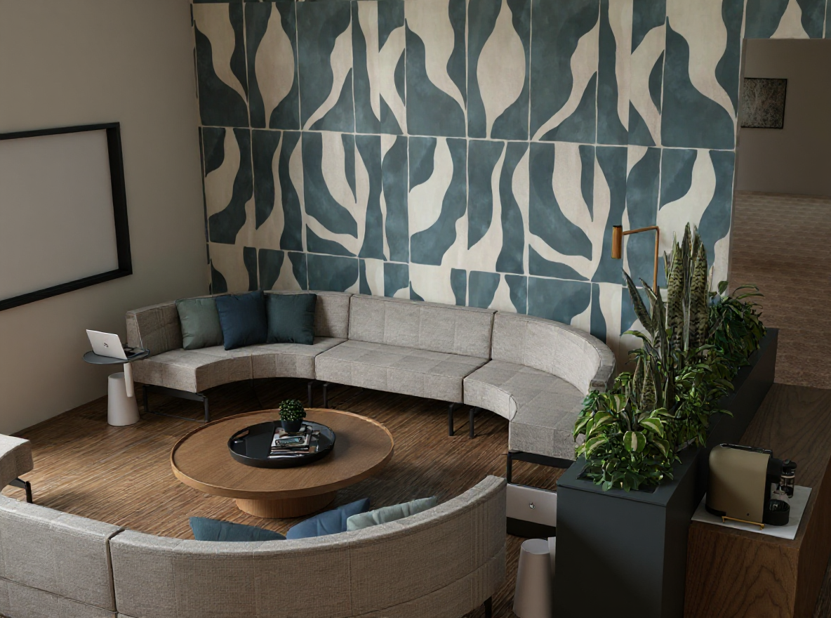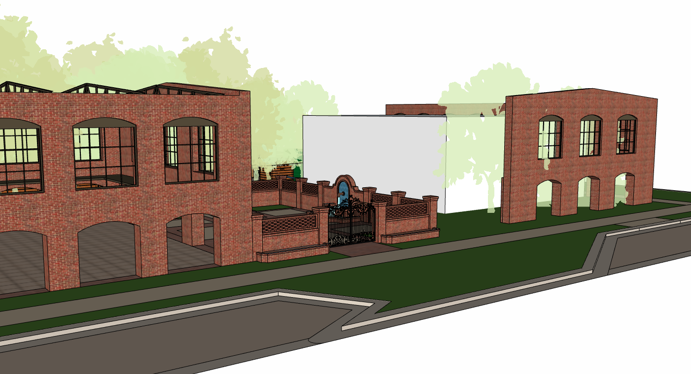 make this a photorealistic rendering of actual buildings in afternoon light with lights on the buildings make the white box a modern steel and glass building with second floor patio make the wall of the second floor back away from the patio railing put patio furniture on the second floor patio