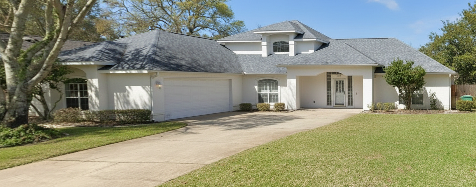preserve the exact proportions window door locations roof geometry and massing from the cad drawing do not alter the architecture render the building with real world materials exterior cladding grey stone white board and batten dark wood for shakers in gable ends roofing black shingles windows high performance glazing with subtle reflections and black trim and black frame doors realistic wood with black frame lighting natural daylight late afternoon sun environment realistic landscaping lawn shrubs small trees clean grading concrete driveway neutral suburban residential context no distractions camera eye level perspective slight angle not perfectly flat elevation 35 50mm architectural lens look style ultra realistic photo accurate high detail sharp focus professional architectural visualization quality suitable for real estate marketing and permit presentations output 4k resolution clean crisp edges no text no labels no people no artistic distortion or stylization