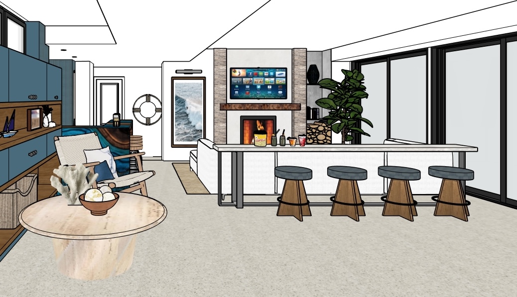 interior shot teal paint is benjamin moore stained glass csp 685 backsplash tile is ames tmlgr815 floor is epoxy concrete image uploaded is a sketchup jpg export create a realistic rendering to show clients the vision maintain the sizing in the jpg fireplace surround has stone masonry columns flanking dekton sandik slab behind tv fireplace mantel is driftwood with epoxy