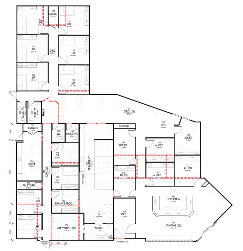 convert this floor plan into a realistic isometric 3d view of a full house show the space from an elevated angle with furniture walls and details visible this is a medical centre called sunny health the front reception area is frameless glass with bench seating a modern clinic with modern treatment and doctors rooms use the same furniture as shows on the plan do not change the orientation of the floorplan