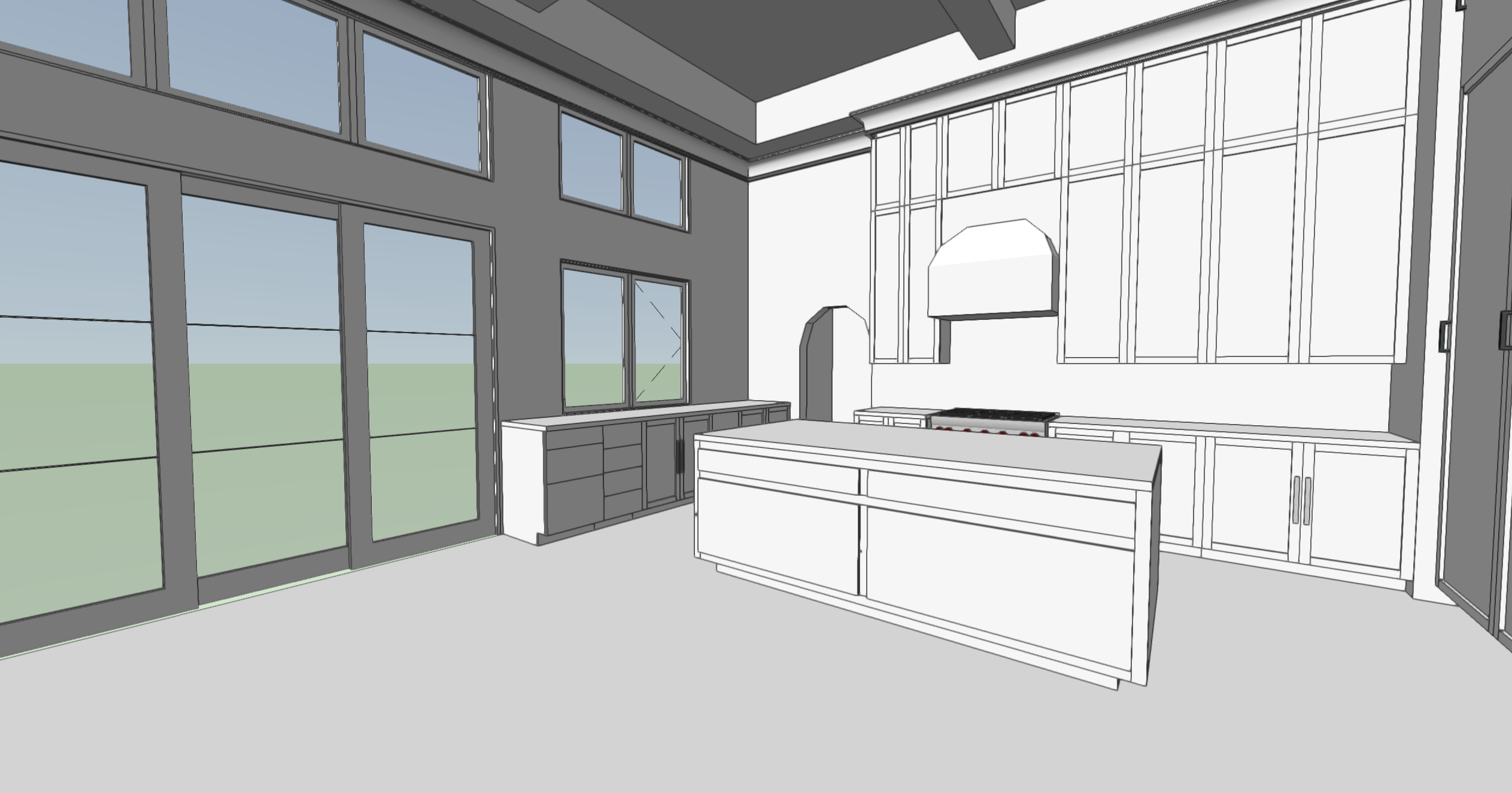 render a modern masculine kitchen with a high ceiling and large windows use soft natural lighting to create a welcoming atmosphere paint the walls in bright white and the ceiling in a light white use sleek stainless steel for kitchen appliances and fixtures choose deep white for the cabinets and island with a polished marble countertop in a subtle white and grey pattern use gold fixtures and hardware set the floor in light grey pocelain tile insert a ceiling design between the beams use matte black for the window and door frames outside depict a lush green landscape behind a concrete stone terrace capture a sense of elegance and tranquility