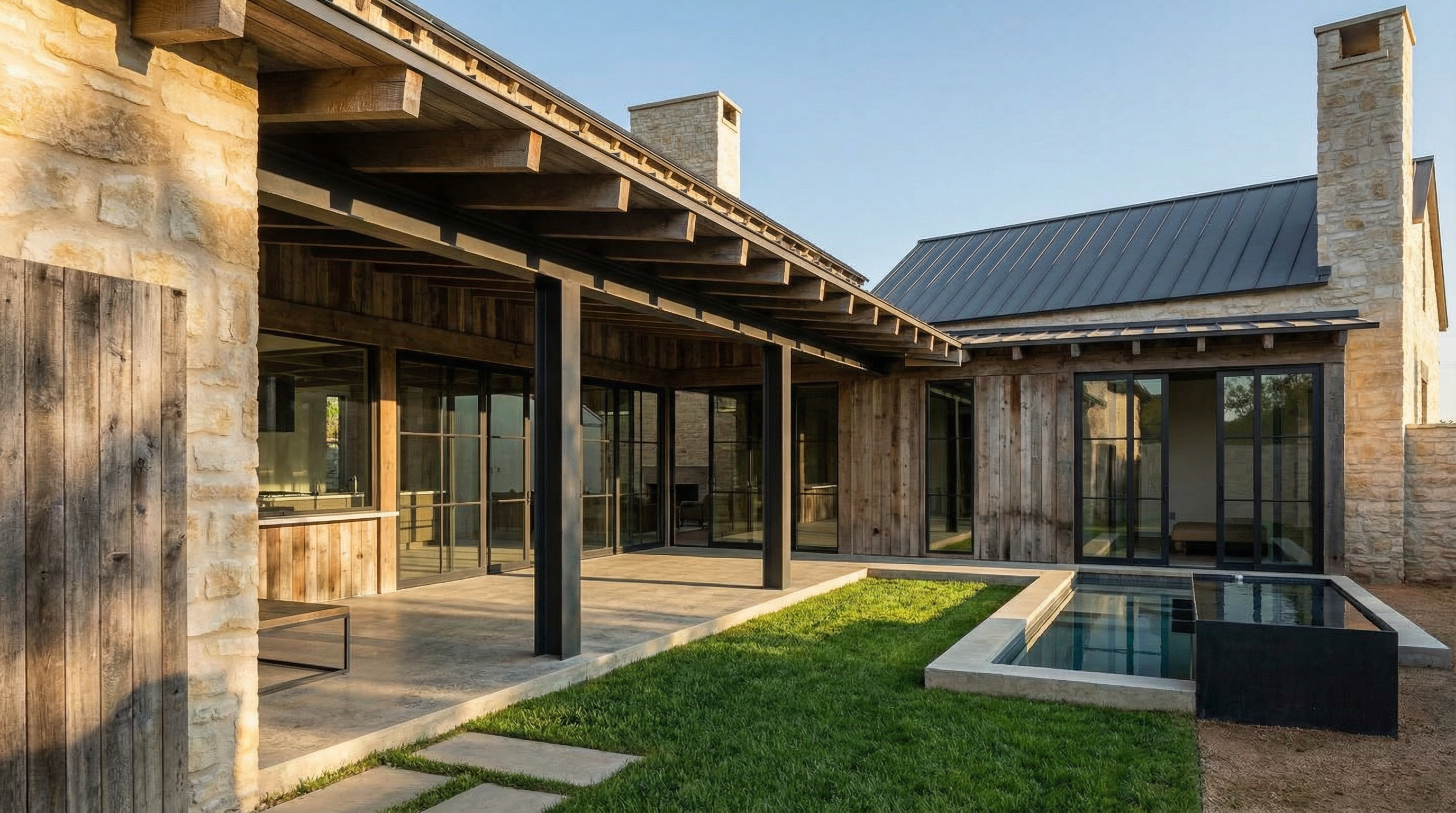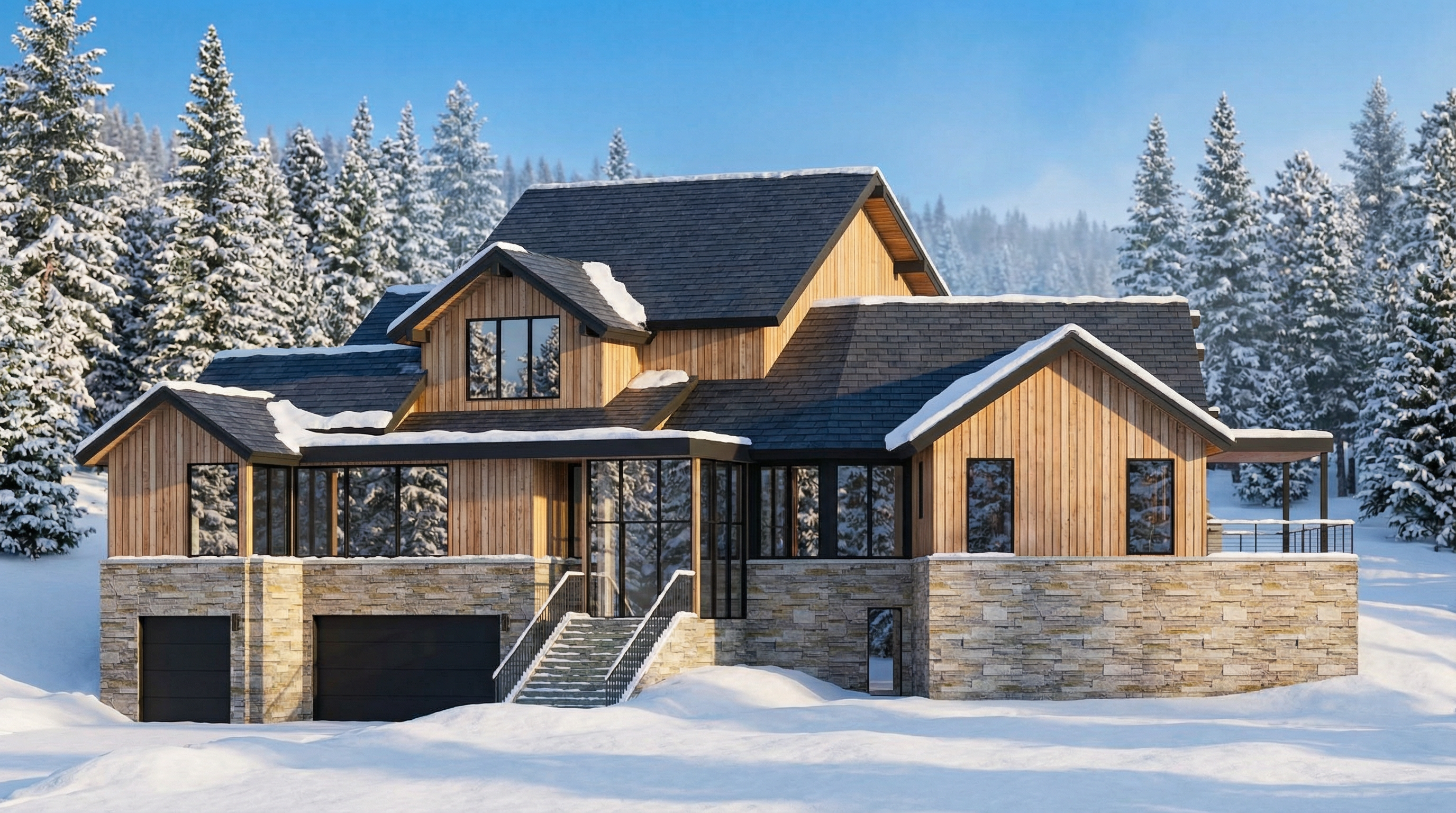 o render a photorealistic 3d perspective of this house in a breckenridge reference the current material style just enhance them black roof light verticle wood siding stone walls keep model geometry the same windows doors roof walls make a dense evergreen forest wintertime snow in the foreground do not change the view only enhance the current materials and make the landscape nicer vegetation snowy background detailed textures in the wood siding and glass reflections and a vibrant clear sky with light atmospheric depth render in hyper realistic architectural visualization quality 8k resolution windows dont see through the home metal roof wood siding