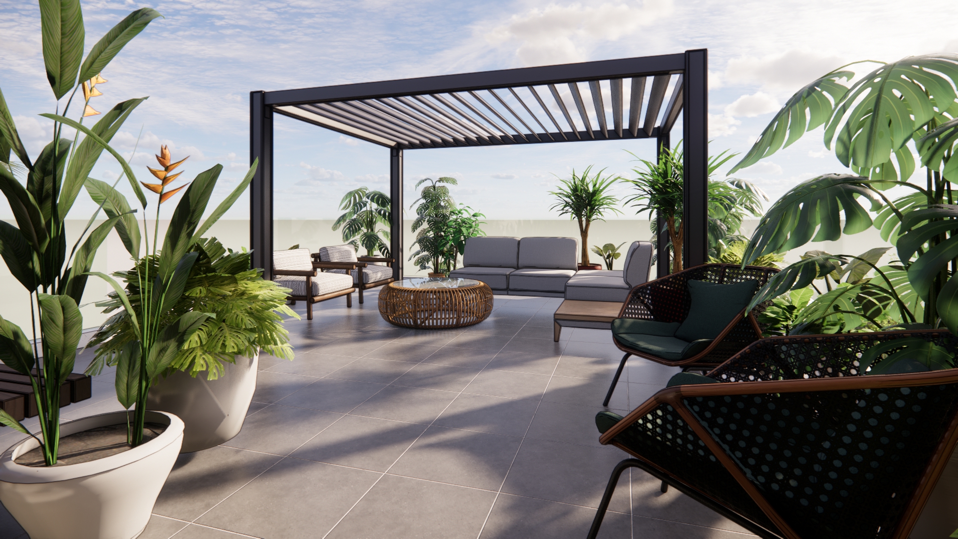 improve this dining table render while keeping the existing furniture and layout enhance textures table chairs and surrounding surfaces for a more realistic and high quality appearance add garden themed decorative elements on the table such as small plants flowers or a modern planter include background context of neighboring houses visible beyond the garden ensure the scene looks lifelike with realistic materials lighting and shadows