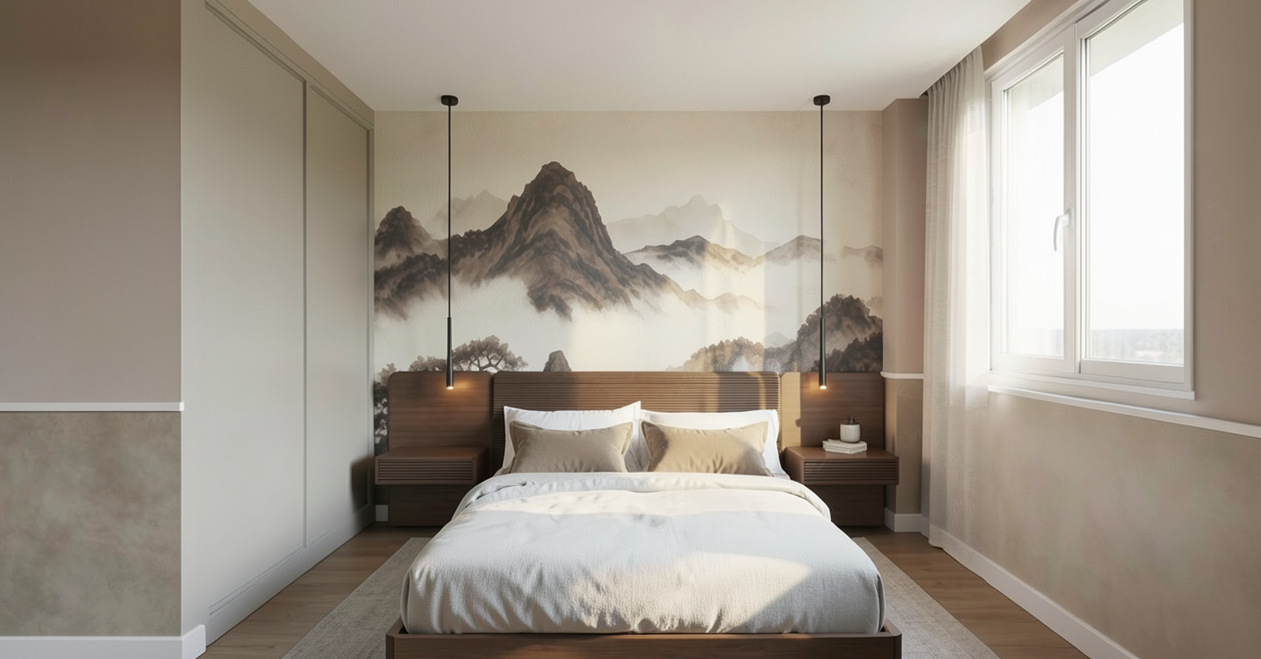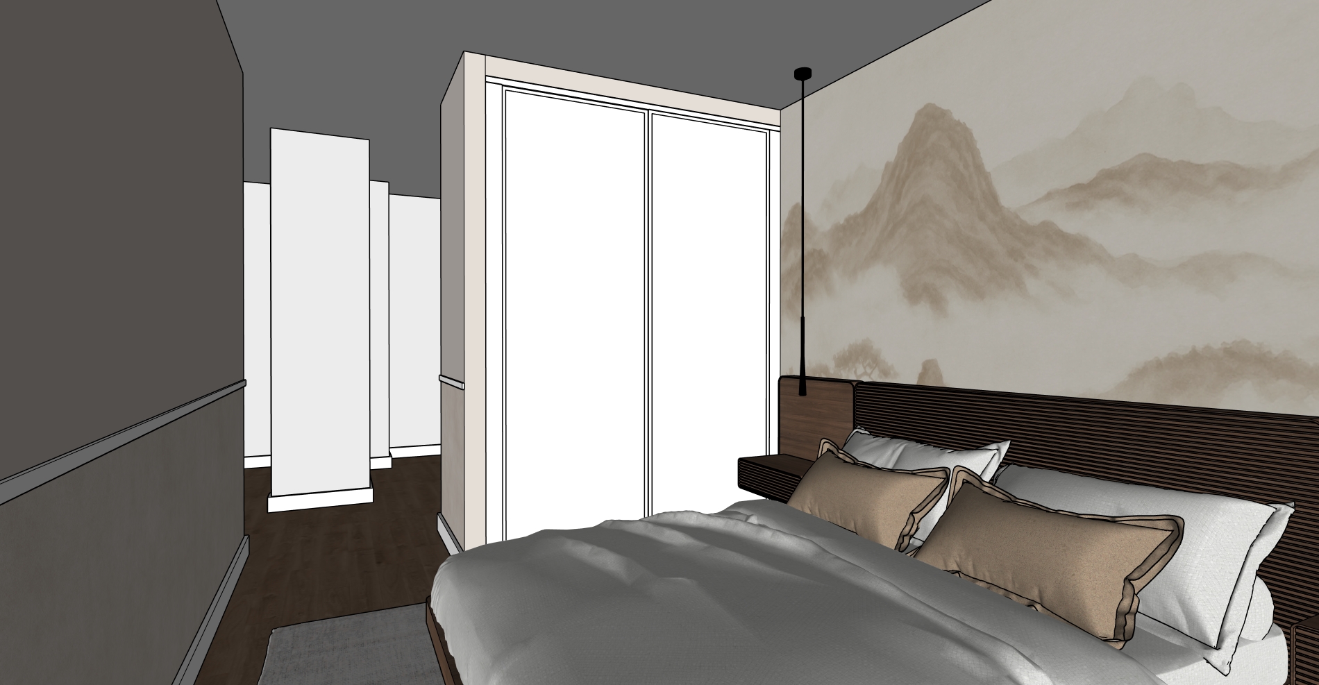 crea una imagen fotorealista a partir de este sketchup mantente fiel al papel pintado original detras del cabecero no lo modifiques a ade unapuerta para cerrar la habitacion haz la imagen mas real