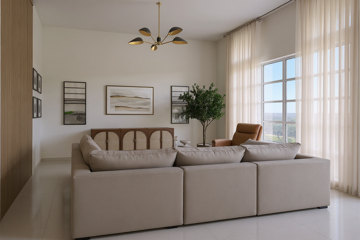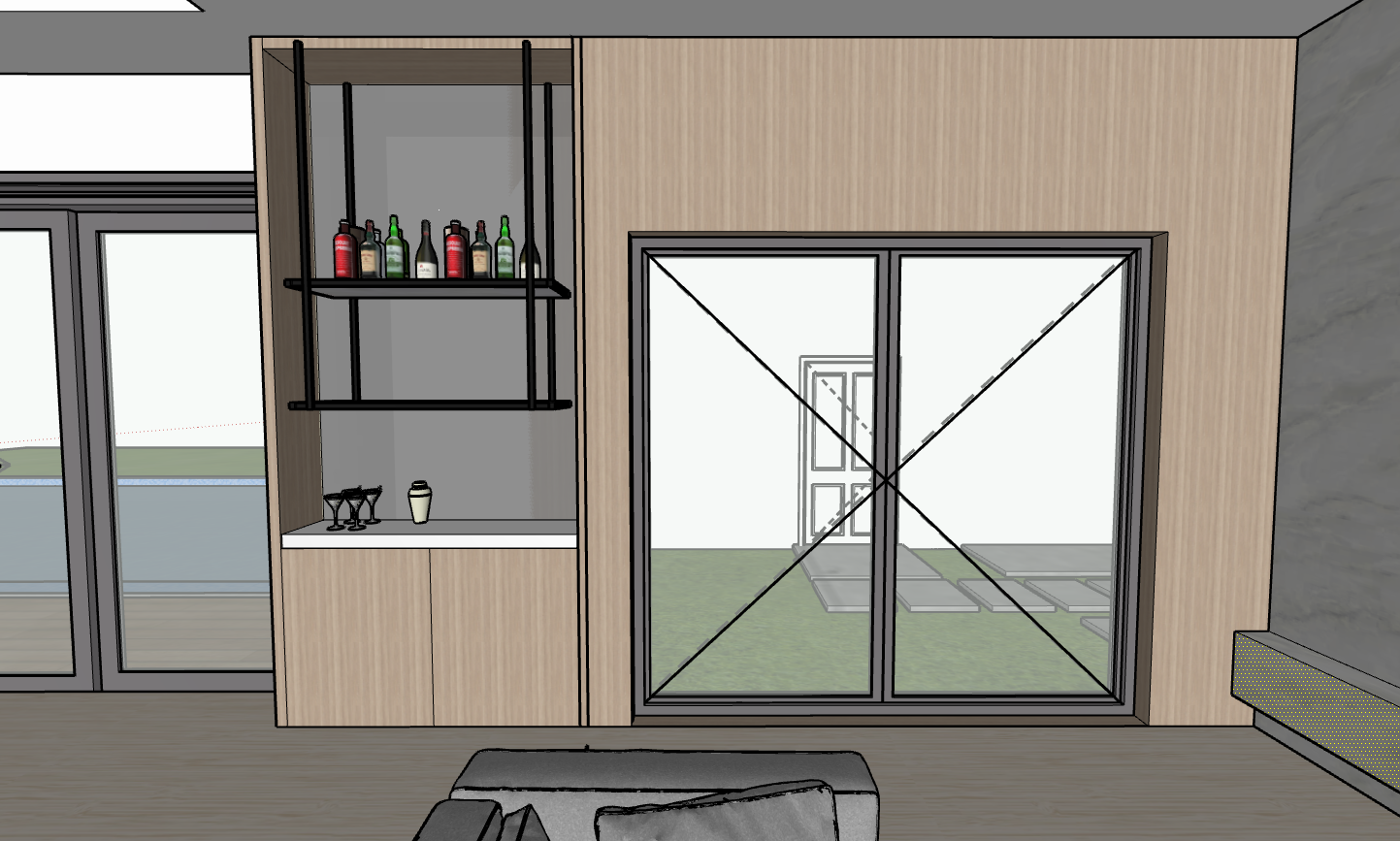 a modern living room corner featuring a built in mini bar integrated into a vertical wood paneling wall the mini bar has a sleek white countertop black metal open shelving with bottles and glasses displayed and subtle backlighting that highlights the bar niche to the right large sliding glass doors framed in dark metal open to a minimalist garden with concrete stepping stones and grass the flooring is a warm wood tone and the overall palette combines natural textures wood metal and glass for a refined contemporary look render in ultra realistic detail with soft daylight entering through the glass doors and accent lighting emphasizing the wood paneling grain and bar shelving