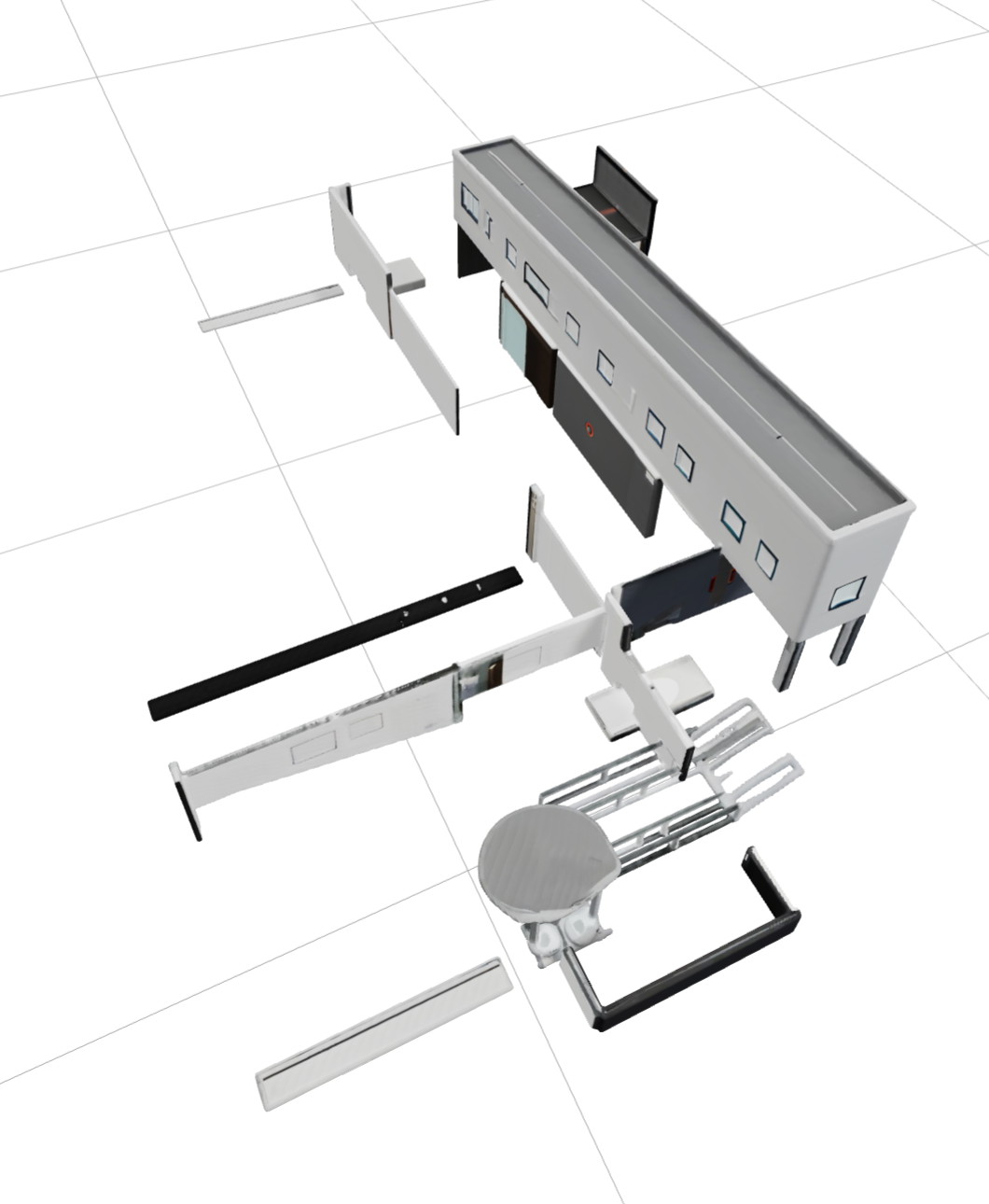 the house will be white with black woodwork the entrance is directly to the right a light blue suzuki suv will be parked in the garden the vegetation will be subtropical with palm trees some flowers and cacti a lawn and some people having a family barbecue with children the windows will be mirrored reflecting the exterior it is daytime and the light is sunny it rained last night and the exterior is still wet there are detached houses on neighboring plots