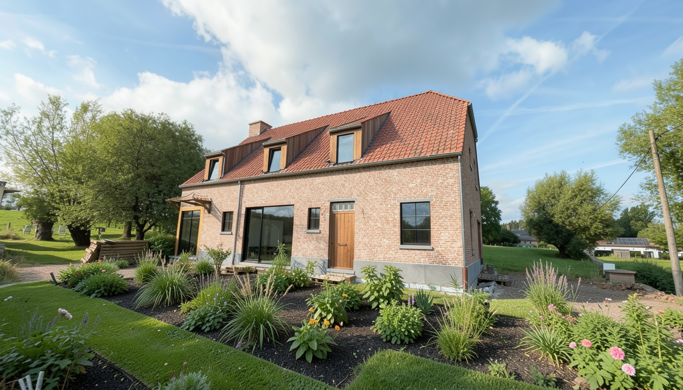 shot like real estate photography 35mm lens natural light photography realistic camera exposure remove car grass in garden and pathway to door and garge on the side