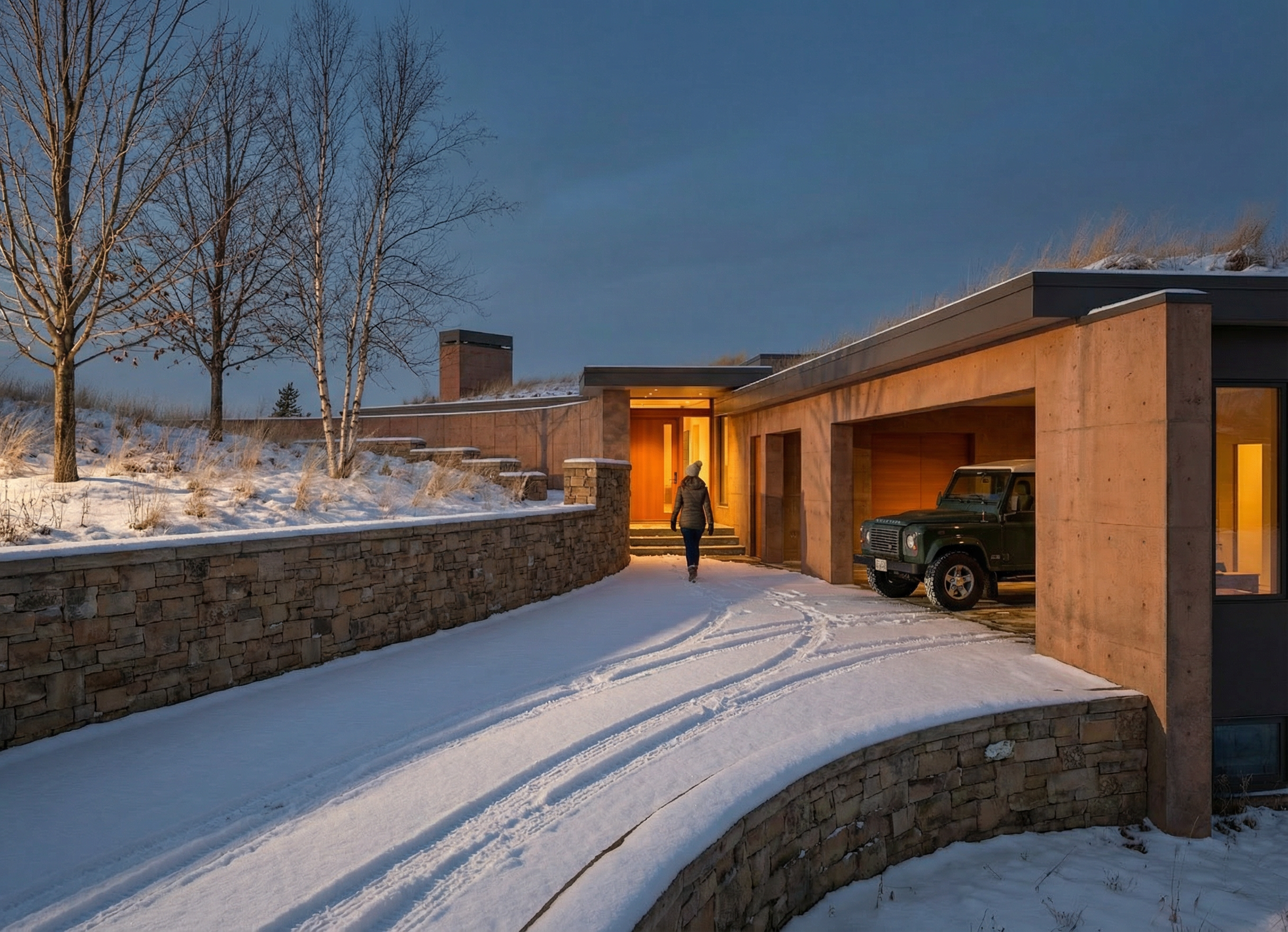 evening view during the winter time add some stars in the sky add a few maple and birch trees with no leaves colored on the left side of the view add wild prairie grass and 3 of snow to the landscape add tire tracks in the snow leading to the car port the house material is site cast concrete with a natural warm clay color add a land rover in the carport add a woman and a small boy walking towards the front door leaving footprints in the snow add a man and a dog leaving the carport walking towards the front door the roof facia is dark gray metal flashing add a jet contrails at a high altitude in the sky