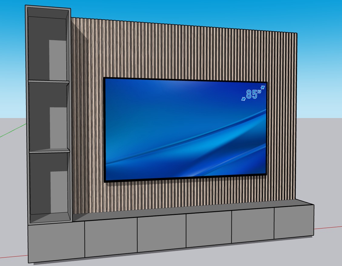 render a modern living room entertainment center the wall features vertical wooden slats with a grey tone oak finish showcasing a large sleek flat screen tv displaying a dynamic deep blue screen the tv unit is a matte gray low profile cabinet with clean lines on the left there s an open shelving unit matching the cabinet in gray add led strips to the shelves the atmosphere is contemporary and sophisticated with soft ambient lighting that highlights the textures and colors creating a cozy yet elegant space