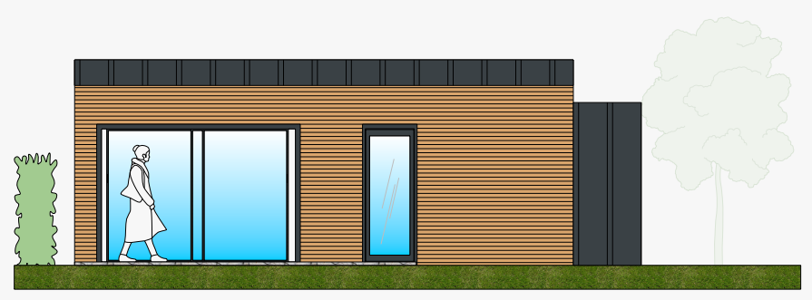 exterior shot render a modern single story house with vertical wooden siding in a warm oak color the roof is flat with a sleek dark gray finish for the windows and door use a contemporary design with black frames and have them reflect the bright blue sky add a potted plant by the entrance featuring lush green leaves in a white planter place a vibrant green lawn along the front and a large fluffy tree on the left featuring soft white foliage and light gray trunk include a wall on the right side in a neutral light gray color the overall atmosphere should be warm and inviting during a sunny day with clear skies architecture