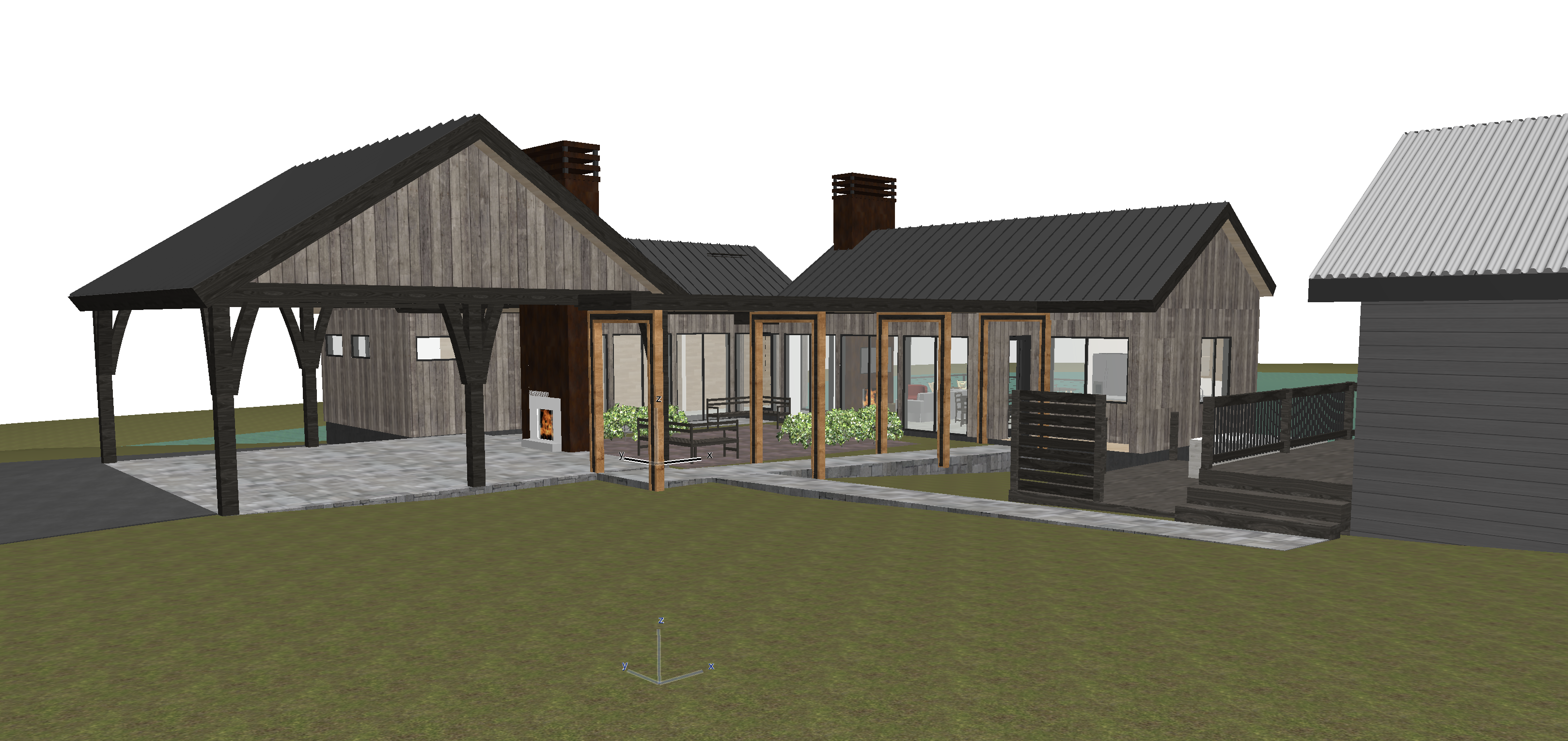 modern farmhouse with covered gathering area in the foreground extensive landscaping with pond to the left distant trees beyond with rolling tree covered hills in the background