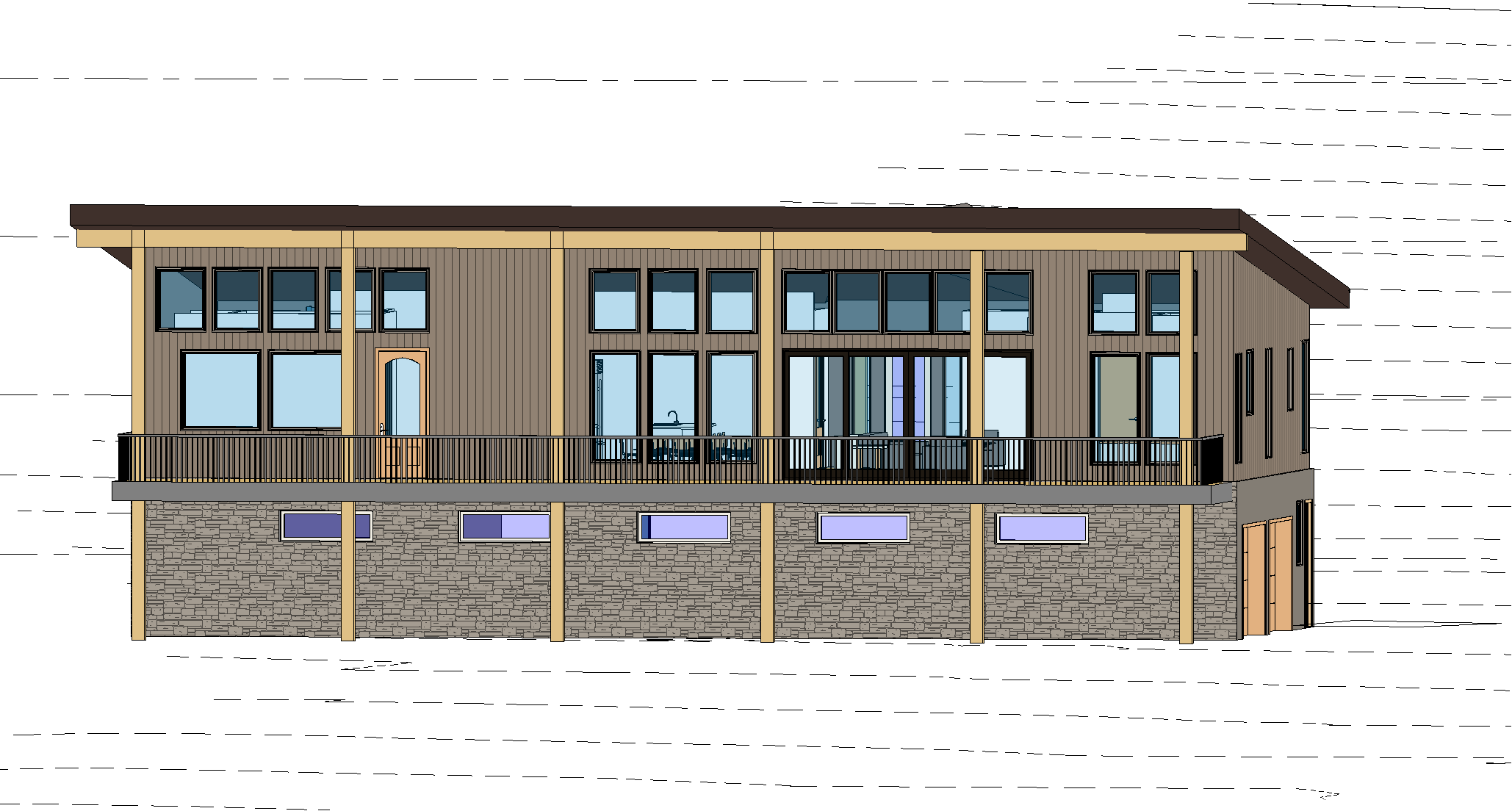 modern two story building with large windows and a flat roof the upper section features vertical metal ribbed panels complemented by dark black window frames the lower section is constructed with textured stone blocks in a light gray hue a sleek black metal railing runs along the balcony the atmosphere is serene and inviting with soft natural lighting illuminating the structure set against a subtle pale blue sky timber posts and beams in golden honey color