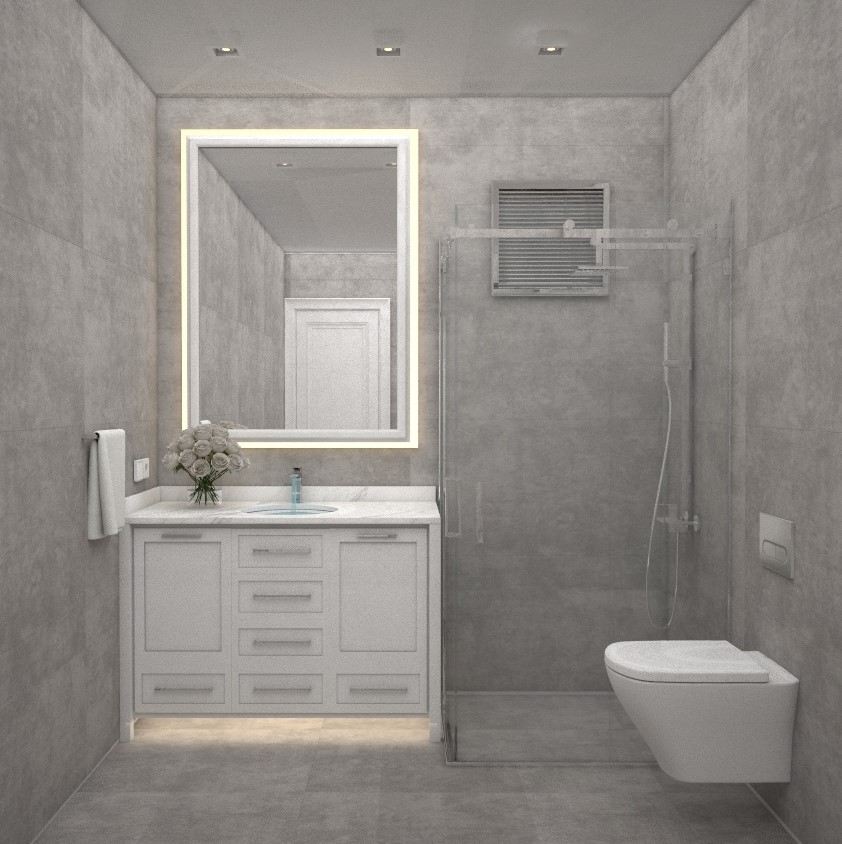 this is a bathroom interior scene do not change any materials colors textures patterns or dimensions keep the tile model tile size cabinet model grout lines fixtures mirror and all architectural elements exactly as they are only adjust lighting shadows reflections and rendering quality make the image more realistic by enhancing soft global illumination natural light bounce subtle reflections on floor tiles realistic shadows clean white balance and higher clarity increase render sharpness improve micro details and keep the scene bright fresh and realistic do not alter any objects placements materials or colors make the scene slightly brighter without washing out the colors keep all materials unchanged increase clarity texture sharpness and micro details without modifying any materials