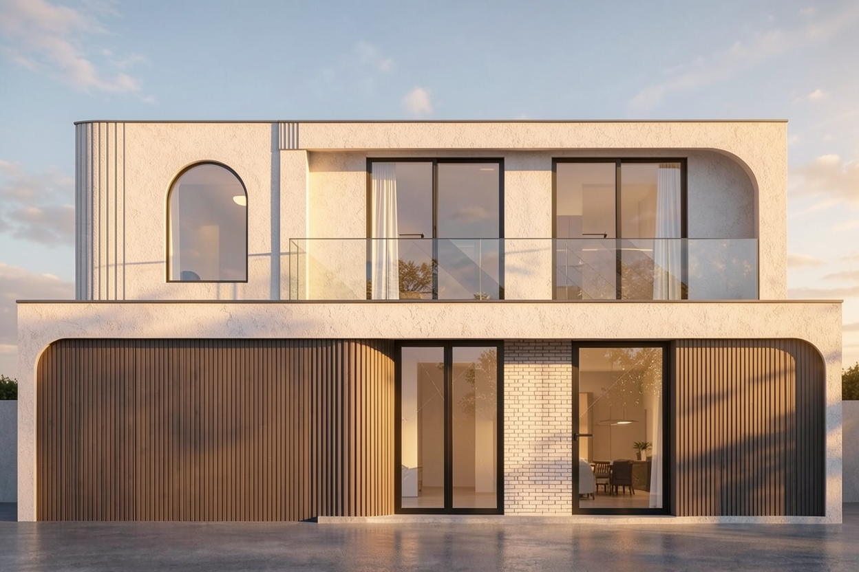 make as photorealistic as possible while keeping textures the same as selection professional landscaping in a lightly wooded scene with good lighting white siding dark shingle roof only