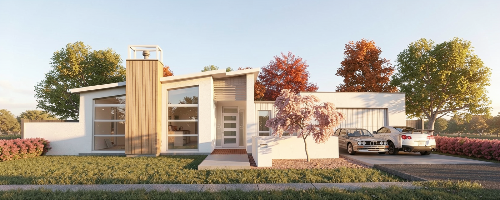 modernist interior shot white box aside from floors and appliances greenery through window architecture