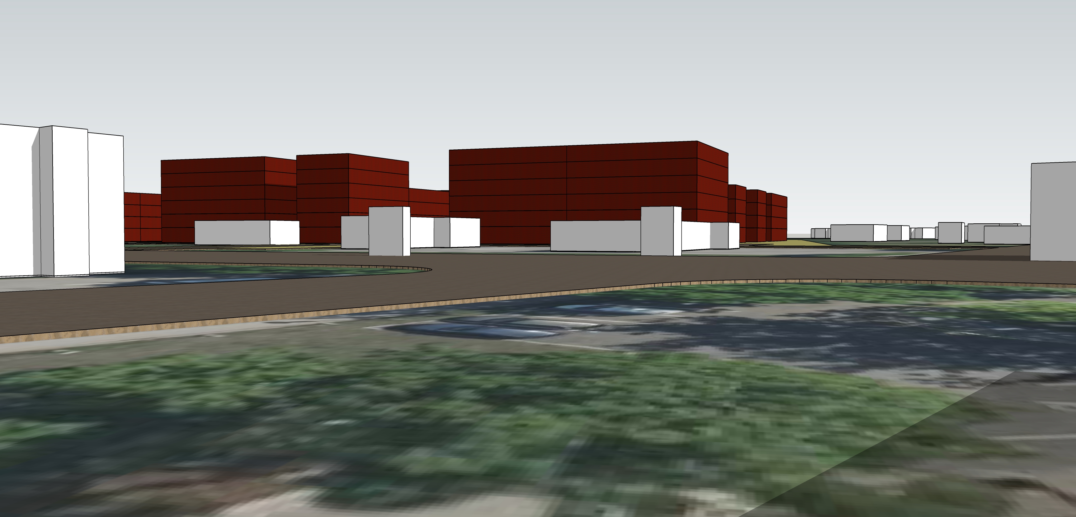 transform the provided urban massing model into a photorealistic architectural rendering contemporary residential development mid rise buildings 4 6 floors high arranged around shared courtyards replace red volumes with realistic facades brick light concrete timber accents large windows and recessed balconies landscaped courtyards trees pedestrian paths subtle people and cars for scale soft natural daylight elevated oblique aerial view professional architectural visualization realistic materials lighting and proportions