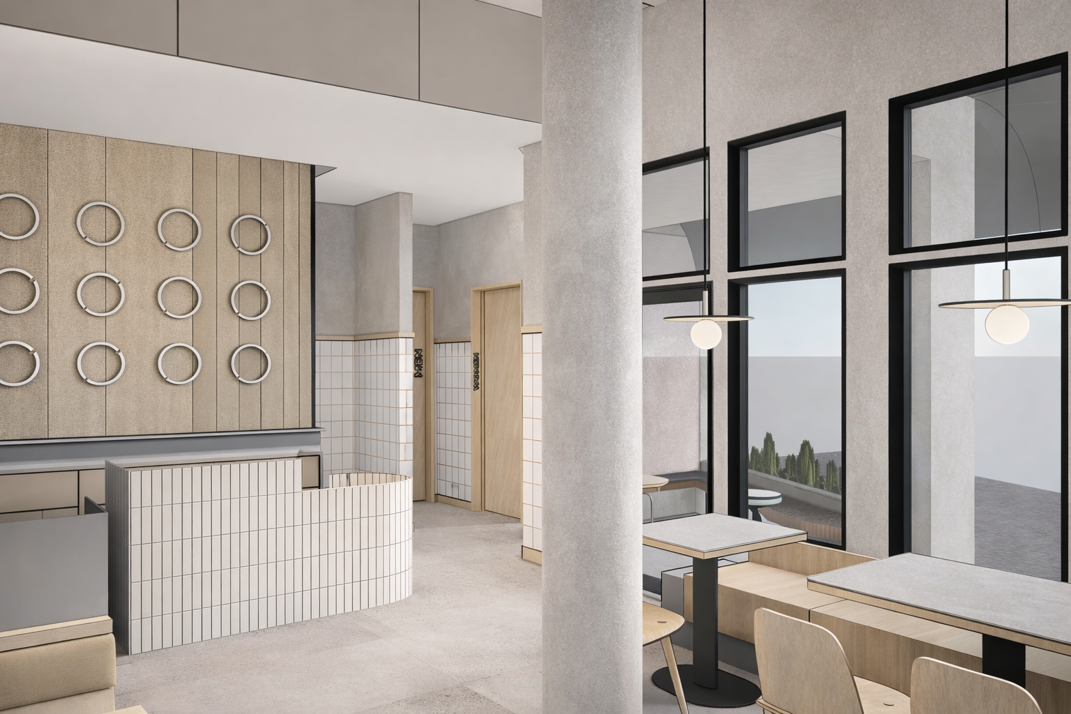 make this into a realistic rendering it should cast minimal shadow and the shadow should be very soft and light and subtle on reception desk the tiled front has thin red grout line thru out
