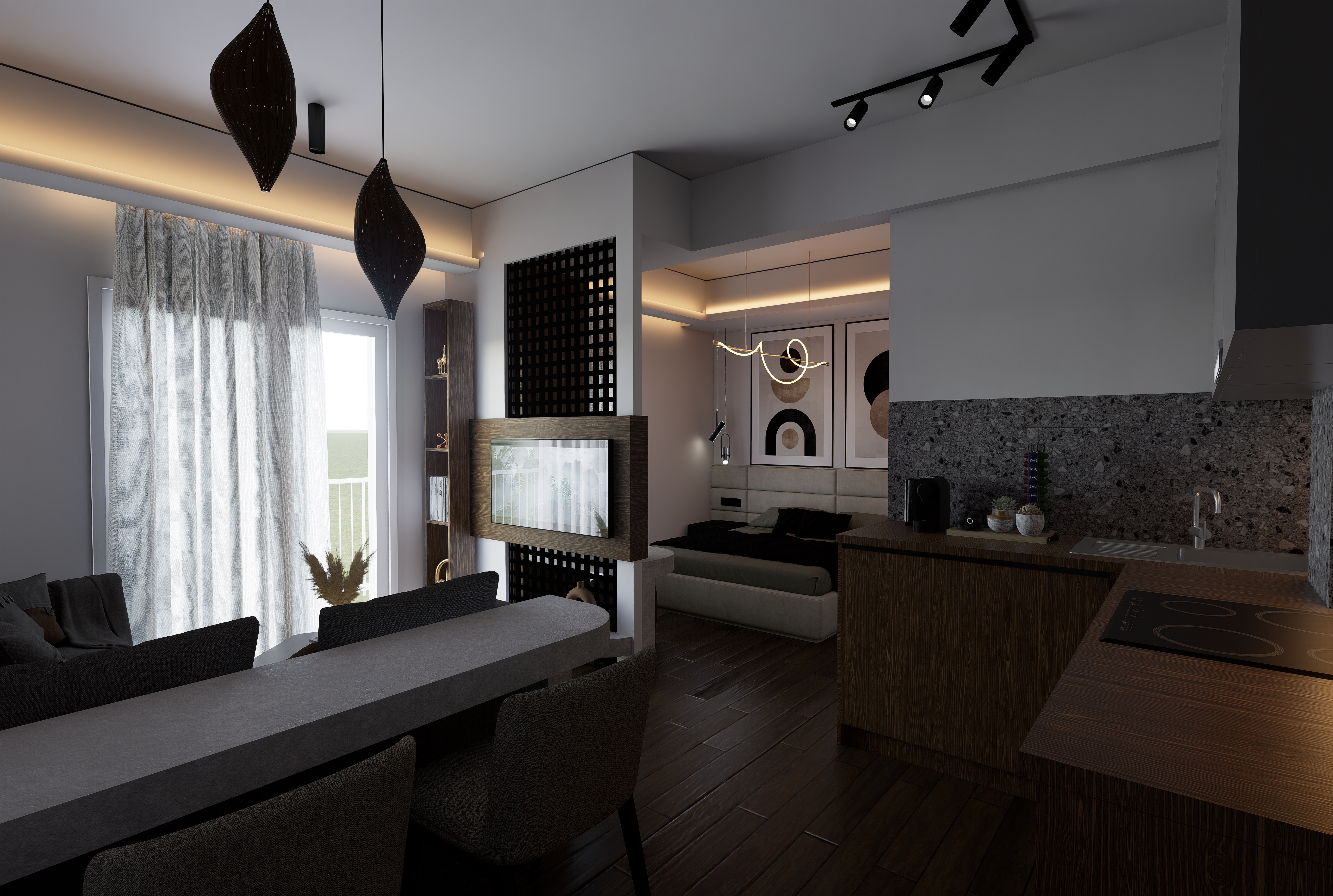 modern interior shot render a modern living space with a sophisticated atmosphere featuring elegant pendant lights in a deep matte black the room should have white walls with warm ambient lighting creating a cozy yet sleek environment include sheer flowing curtains in light gray softly diffusing the natural light from the window the seating and dining area should feature dark gray cushions paired with a minimalist dining table in a medium gray tone the wooden elements like the partition and kitchen cabinets should display a rich dark brown with a natural grain texture the kitchen backsplash should be a luxurious speckled gray stone perfectly complementing the modern design enhance the mood with abstract artwork in muted tones of black copper and white adding a touch of artistic flair to the space architecture