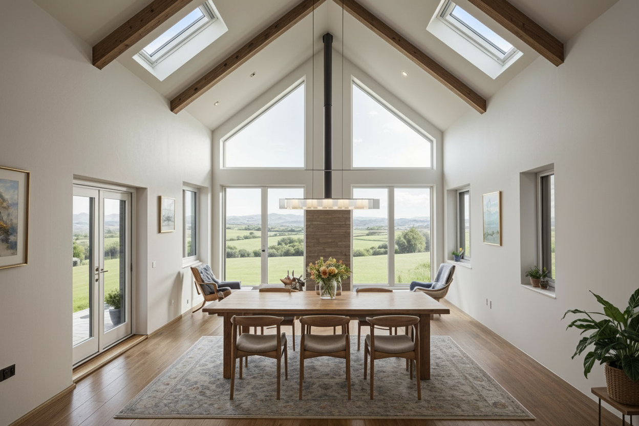 add a stove centred along the backwall and the flue kinked to the right where it meets the roof remove the picture frames add a person lounging in one of the eames chairs