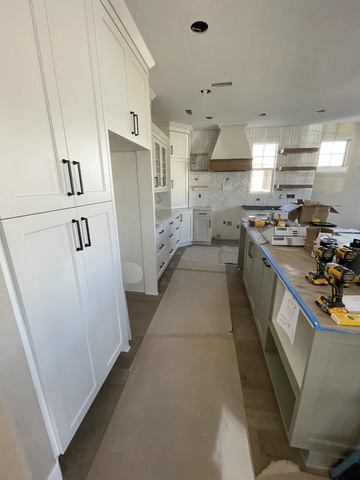 do not change the cabinets in any way preserve the exact cabinet colors materials finishes dimensions door and drawer styles hardware spacing alignment and all geometry exactly as shown do not alter the countertop shape backsplash appliances flooring lighting fixtures or wall structure only remove the construction materials clutter and mess from the scene clean the room and make it look finished and staged add a few simple tasteful home accessories appropriate for the style of the space but do not add or remove any furniture windows or architectural elements maintain the original lighting direction and realism enhance clarity and polish the photo while keeping the cabinetry and room design completely unchanged do not alter the lighting to keep the cabinet colors as they are in the image add a slide in range below the hood and a refrigerator in the opening to the right of the full height pantry cabinet