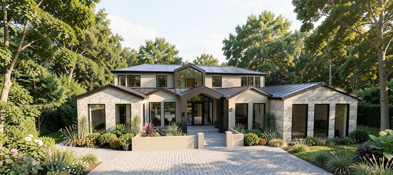 make upper roof black shingles add pavers and driveway in the front more natural tone outdoor shot make all the window and door frames black add more plantings around the pavers
