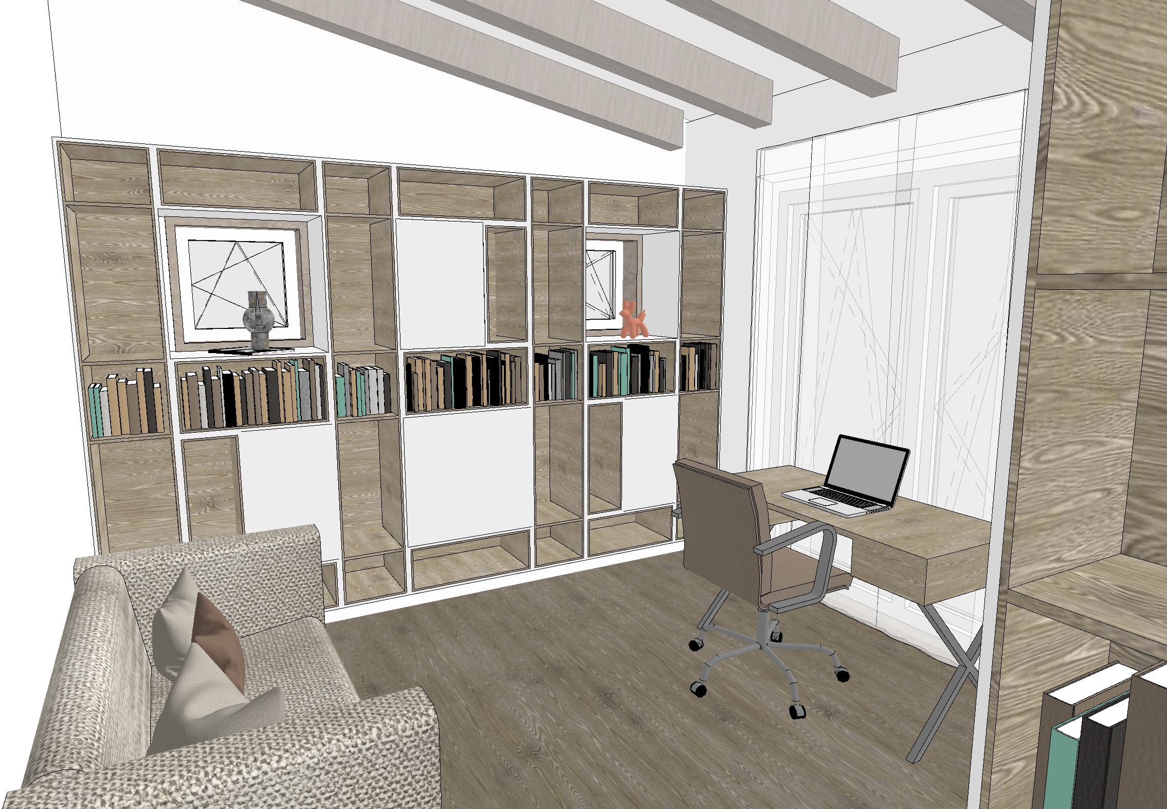 keep interior design and furniture position as it is realistic photo of a home office in daylight bright and welcoming atmosphere white walls ral9016 white built in cabinets ral9016 open shelves in light stained oak wood non red or non yellow oak wood wooden desk in a light oak with chrome legs light white semi transparent curtains ergonomic vitra desk chair with light leather upholstery and chrome frame white ceiling beams jab taupe fabric sofa folded keeps the position as it is decorative office elements such as books binders and vintage accessories macbook laptop notebooks crystal water glass and coffee cup on the desk warm 2700 k lighting harmonious composition tidy and elegant workspace with a cozy lived in feel no orange or yellow material look the two square windows shows outdoor background and are involved in the shelf system