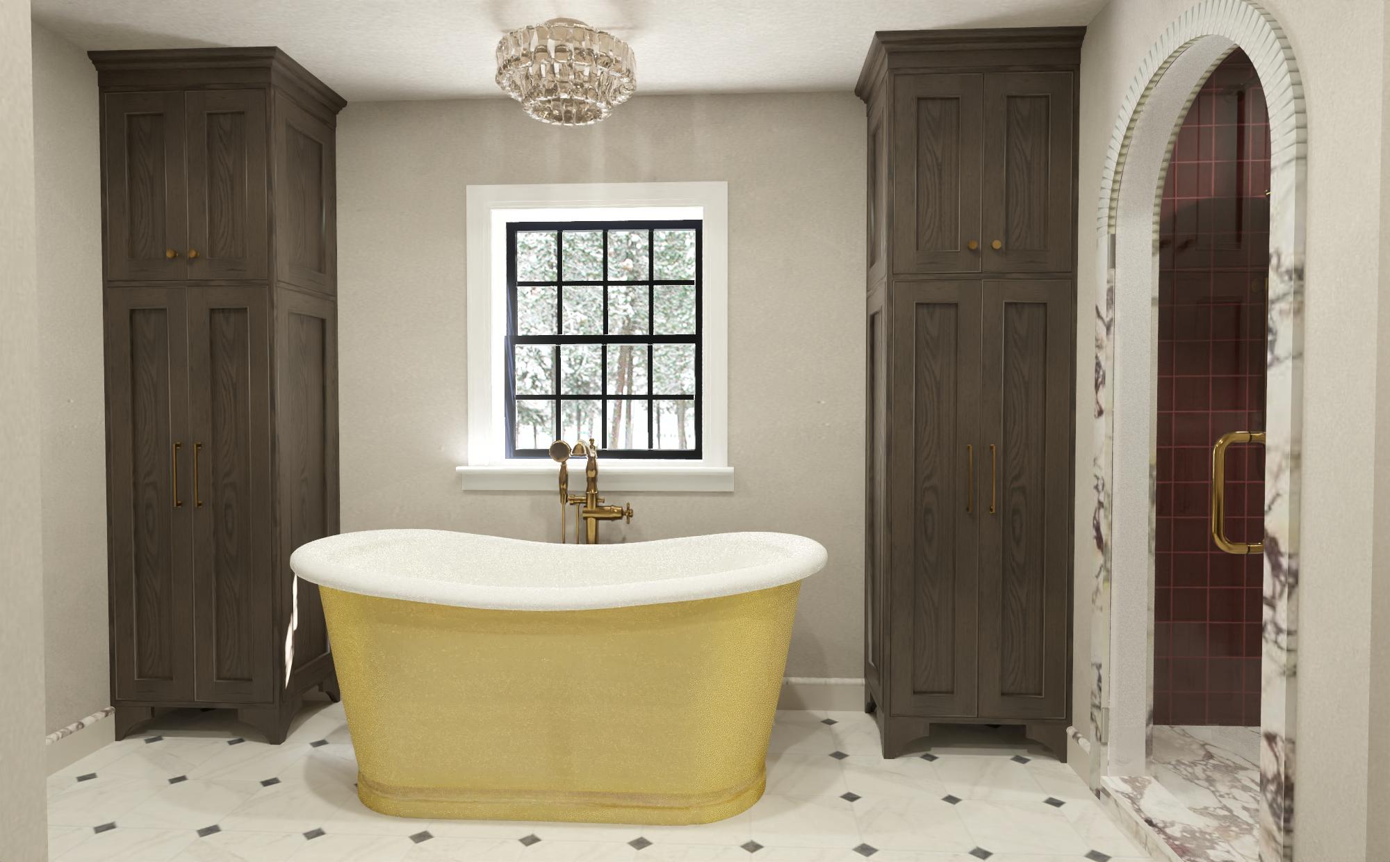 ad a subtle limewash finish to the walls make the outside of the tub polished gold the inside should stay white