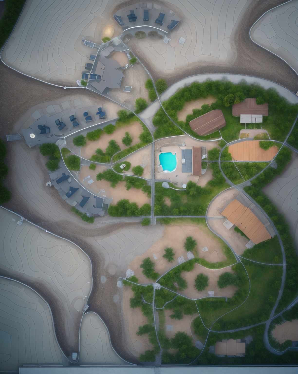 rooftop shot luxury cabin site plan in a natural landscape make the cabins dark gray but keep everything in greenery architecture