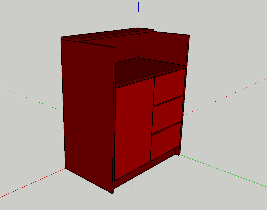 burgundy colored reception desk on wood one cabinet door and 3 drawers are visible no handles hidden handle