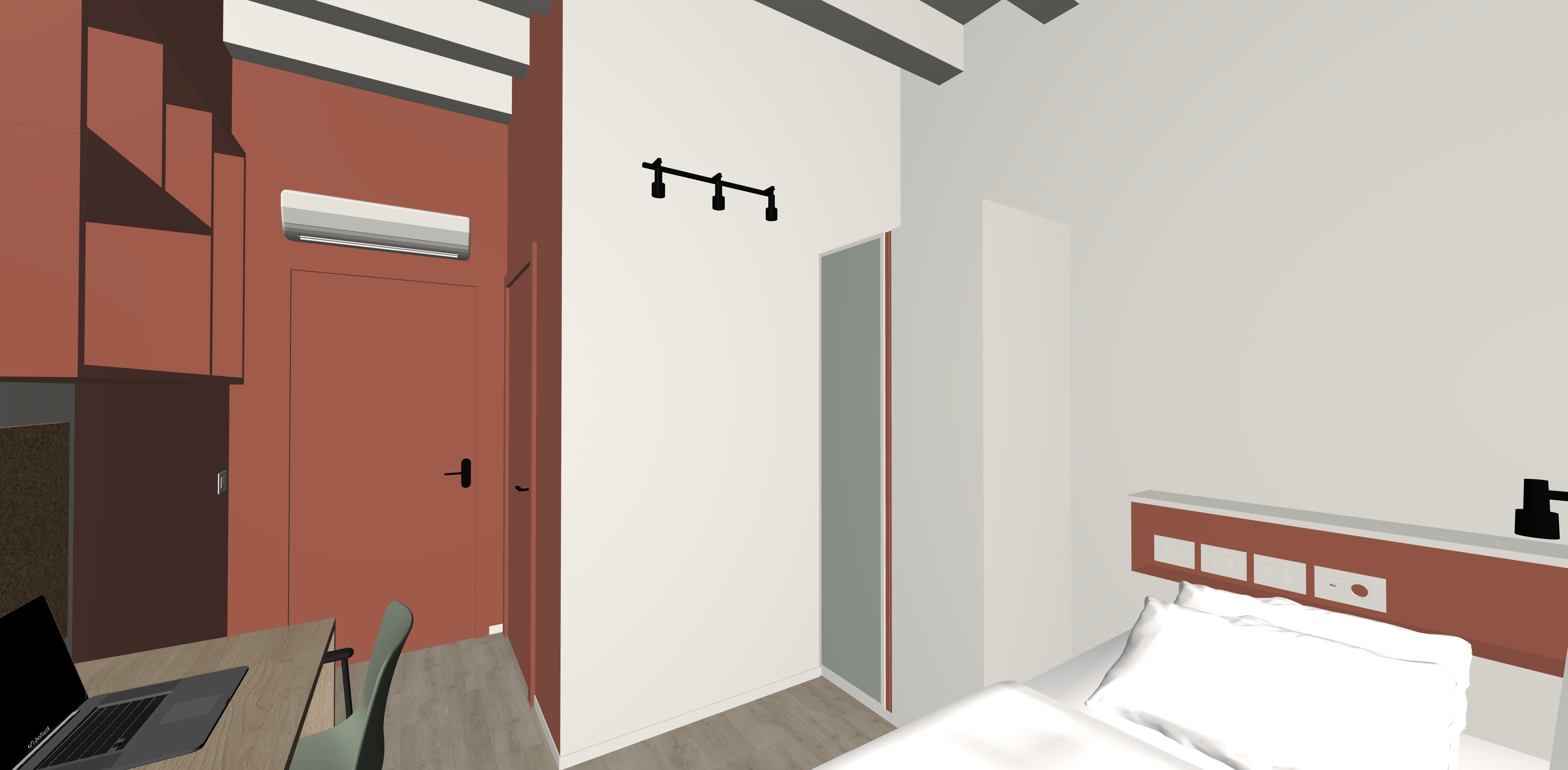 travi e soffitto in legno sbiancato la parte bianca delle pareti tinteggiata arreda la stanza come uno studente universitario