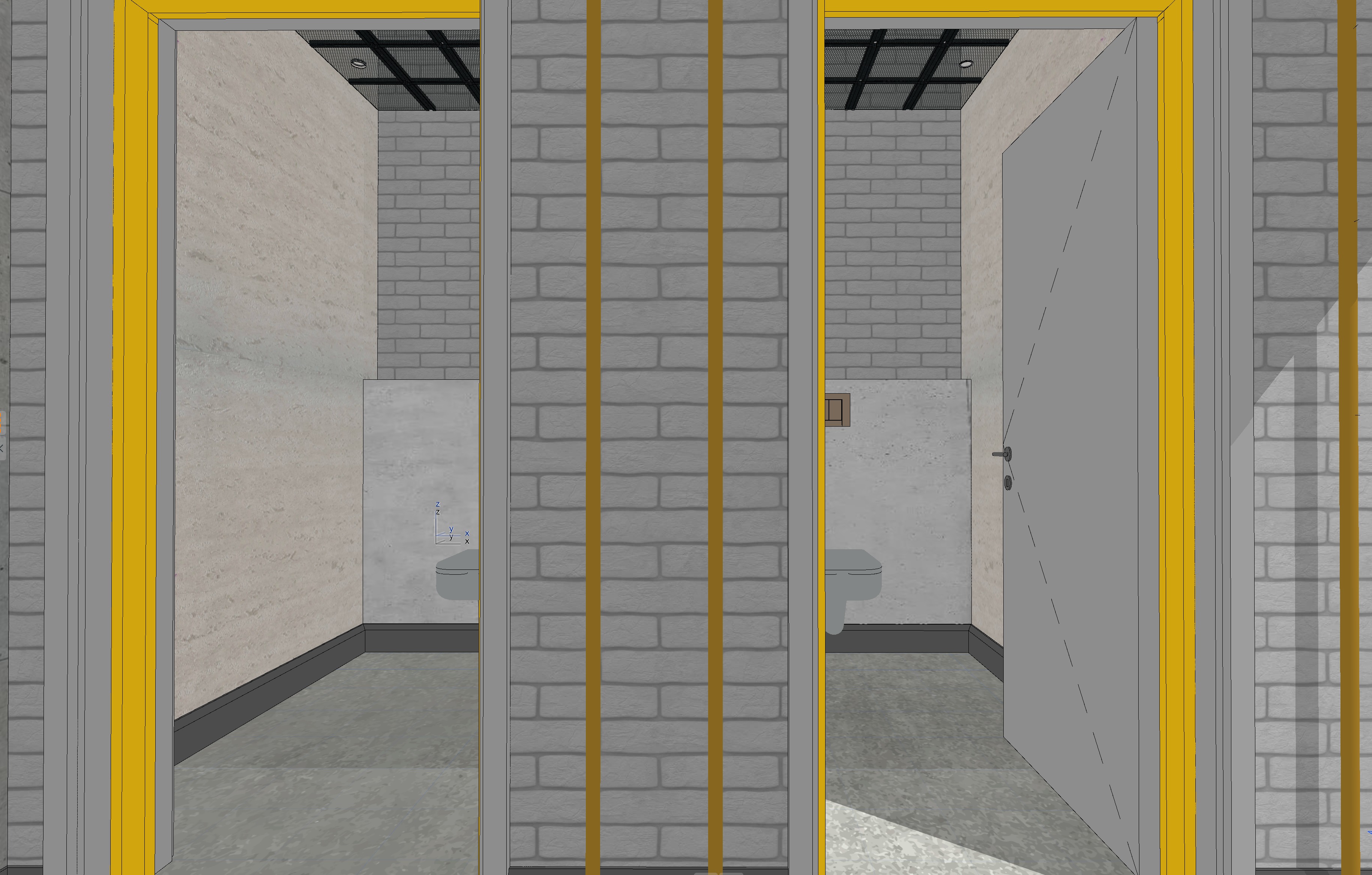 ultra realistic architectural interior render of an industrial style public bathroom corridor raw exposed concrete walls and structural surfaces with subtle imperfections and formwork texture in the back gray painted brick wall with a series of bathroom stall doors framed in bright industrial yellow metal vertical decorative exposed pipes painted safety yellow run along the wall between the doors black toilets and flush button the ceiling is a black steel metal mesh structure with integrated spot neon lights acting as the main lighting element lighting should feel slightly moody but functional typical of contemporary industrial interiors the floor is polished concrete style contemporary industrial architecture brutalist influences high realism materials rough concrete painted brick powder coated metal stainless steel fixtures safety yellow industrial paint lighting realistic global illumination soft indirect lighting from mirror backlights neon ceiling lights casting subtle reflections on concrete floor mood clean but raw industrial public restroom slightly cinematic architectural visualization quality